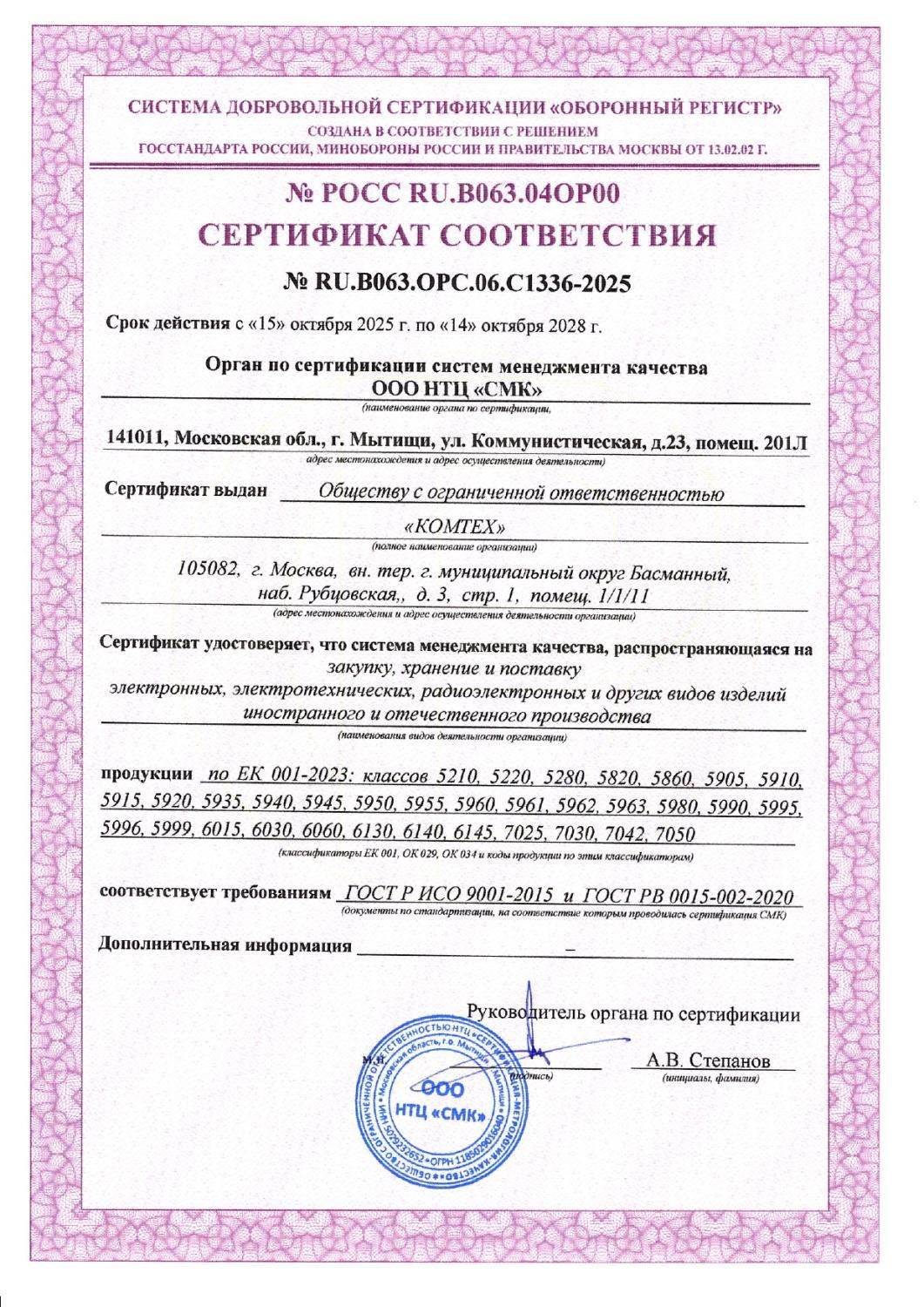 Сертификат соответствия системы менеджмента качества требованиям ГОСТ Р ИСО 9001-2015, ГОСТ РВ 0015-002-2020 и Свидетельство о квалификации поставщика дают право на поставку электронных компонентов предприятиям и организациям оборонно-промышленного комплекса в целях выполнения Государственного оборонного заказа, а также производителям продукции двойного и общепромышленного назначения.