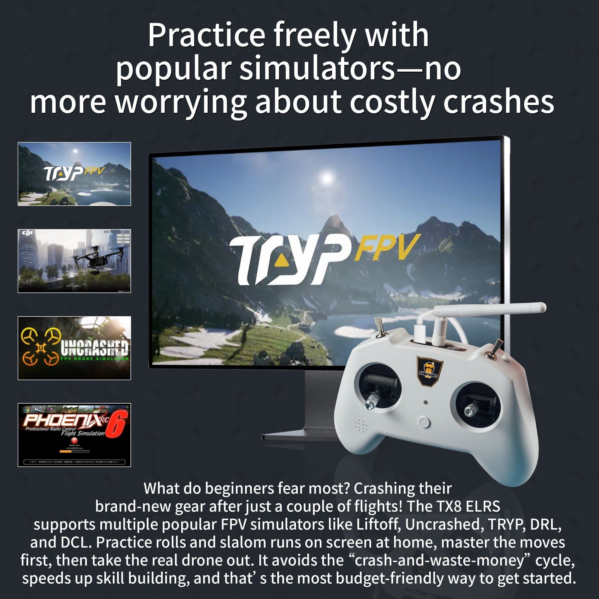 Компактный и легкий радиопередатчик, созданный специально для начинающих пилотов FPV. TX8 ELRS разработан с одной целью — устранить барьеры входа в хобби: он не требует сложных настроек, готов к полету через 3 секунды после включения и весит менее 200 грамм, что легче большинства смартфонов. Благодаря встроенному модулю ExpressLRS (ELRS) мощностью 100 мВт, пульт обеспечивает стабильную связь с дроном на расстоянии до 2 км. Поддержка популярных FPV-симуляторов позволяет безопасно обучаться и оттачивать навыки дома. Это идеальное решение для тех, у кого уже есть совместимые приемники ELRS или кто планирует их приобрести отдельно.