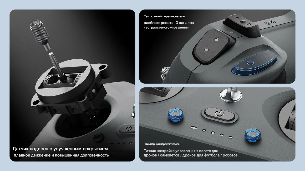 LiteRadio 4 — это компактный 10-канальный радиопередатчик начального уровня с протоколом ExpressLRS 2.4 ГГц, разработанный для пилотов FPV-дронов, роботов, дрон-футбола и фиксированных крыльев. Аппаратура оснащена потенциометровыми стиками с износостойким покрытием, двумя тактильными переключателями расширения каналов и двумя выделенными триммерами для точной балансировки в полёте. Поддерживает беспроводное подключение к FPV-симуляторам через Bluetooth (режим джойстика) и проводное соединение через USB Type-C. Встроенный аккумулятор 1S 2000 мАч обеспечивает до 8 часов работы, а быстрая зарядка 15 Вт восполняет заряд за 40 минут. Общие характеристики — Тип: Радиопередатчик (Radio Transmitter) — Модель: LiteRadio 4 (Standard Edition) — Назначение: Дистанционное управление FPV-дронами, роботами, дрон-футбольными мячами, фиксированными крыльями и другими RC-моделями — Ключевое преимущество: Компактность, 10 каналов, поддержка беспроводных симуляторов и быстрая зарядка в доступном корпусе — Количество каналов: 10 — Протокол: ExpressLRS 2.4 ГГц — Выходная мощность RF: 25 мВт / 50 мВт / 100 мВт (регулируемая) — Цвет: Серый (Gray) — Вес: ~210 г — Габариты (Д x Ш x В): 172.5 x 118.5 x 72.5 мм Ключевые особенности — 10-канальное управление с расширением: Два дополнительных тактильных переключателя на тыльной стороне аппаратуры расширяют количество выходных каналов до 10, что позволяет гибко настраивать управление для различных типов моделей. — Выделенные триммеры мгновенной балансировки: Два четырёхпозиционных триммера с центральным сбросом позволяют оперативно корректировать смещение стиков в полёте, без необходимости входить в меню. — Потенциометровые стики с износостойким покрытием: Обеспечивают плавное и точное управление с повышенным ресурсом работы, оптимальны для начального и среднего уровня пилотирования. — Беспроводное подключение к симуляторам: Режим Bluetooth Joystick позволяет подключаться к FPV-симуляторам на ПК, планшетах и мобильных устройствах без проводов. Режим Xbox обеспечивает интеграцию с DJI Virtual Flight. — Длительная автономность и быстрая зарядка: Встроенный LiPo-аккумулятор 1S 2000 мАч обеспечивает 4–5 часов работы при мощности 100 мВт и до 8 часов при 25 мВт. Зарядка 15 Вт через USB Type-C полностью восполняет ёмкость за 40 минут. — Поддержка BETAFPV Configurator: Настройка параметров, обновление прошивки и диагностика через фирменное ПО с поддержкой Windows, macOS и Linux. Технические характеристики — Передатчик: ExpressLRS 2.4 ГГц — Выходная мощность: 25/50/100 мВт (регулируемая) — Каналы: 10 — Стики: Потенциометровые (Potentiometer) с износостойким покрытием — Триммеры: 2 шт., 4-позиционные, с функцией сброса в центр — Дополнительные переключатели: 2 тактильных (тыльная сторона) — Подключение к симуляторам: Bluetooth (режим джойстика), USB (проводное) — Поддерживаемые симуляторы: VelociDrone, Liftoff, TRYP, Erea Drone, DRL, DCL, DJI Virtual Flight (через Xbox Mode) и др. — Аккумулятор: Встроенный 1S LiPo, 3.7 В, 2000 мАч — Время работы: 4–5 ч (100 мВт) / до 8 ч (25 мВт) — Зарядка: USB Type-C, 5 В, макс. 3 А (15 Вт), время зарядки ~40 мин — Конфигуратор: BETAFPV Configurator (поддержка ELRS3) — Цвет: Серый (Gray) — Вес: ~210 г — Габариты: 172.5 x 118.5 x 72.5 мм Область применения — Начинающие и продолжающие пилоты FPV-дронов, переходящие с симуляторов на реальные полёты. — Управление дрон-футбольными мячами и робототехническими платформами. — Пилотирование фиксированных крыльев (самолётов). — Тренировки и обучение на FPV-симуляторах (дома, в