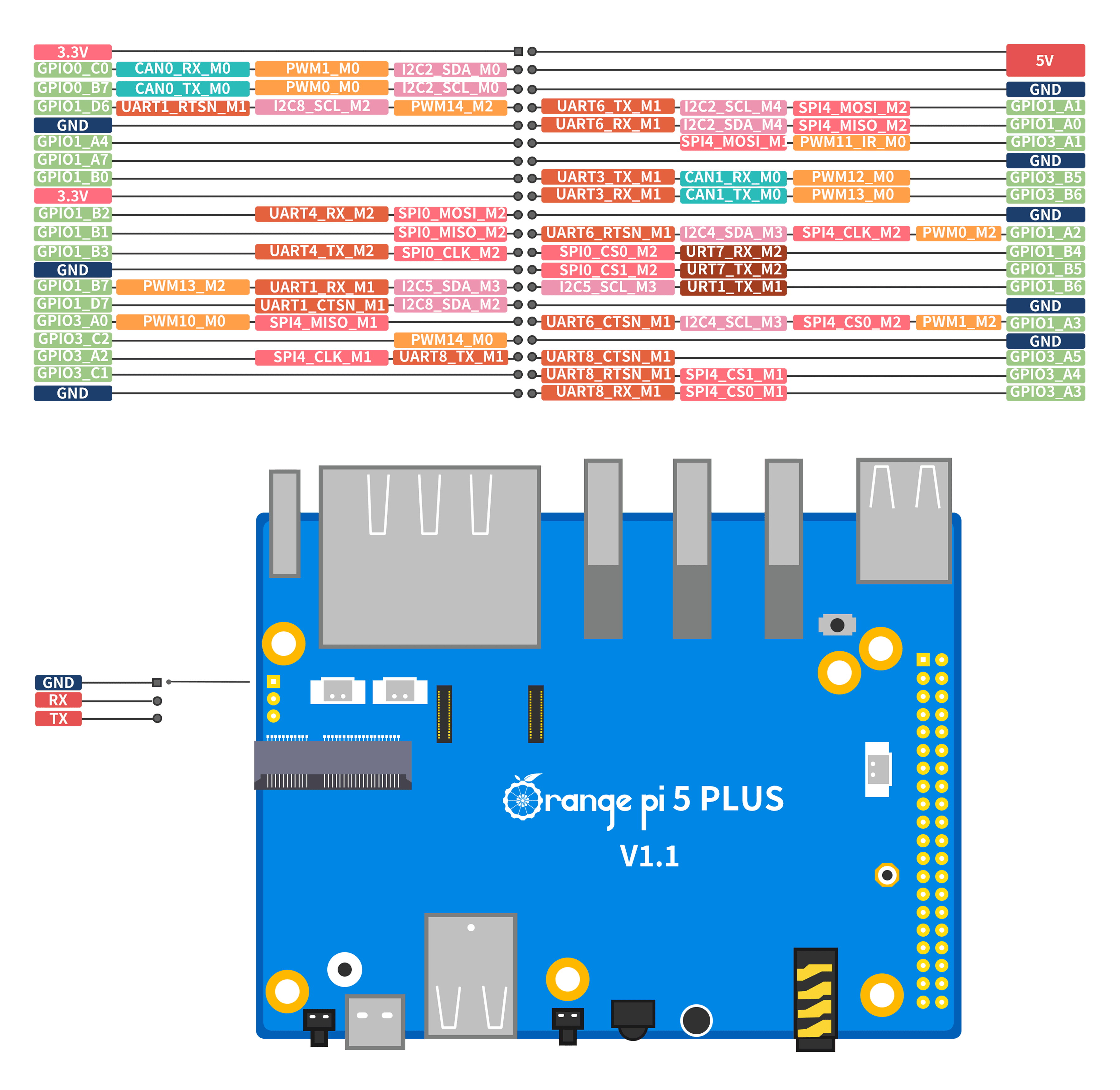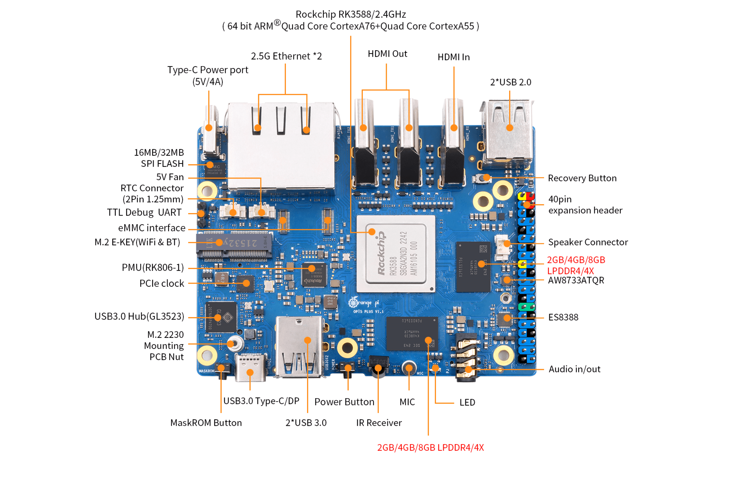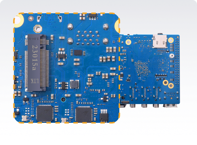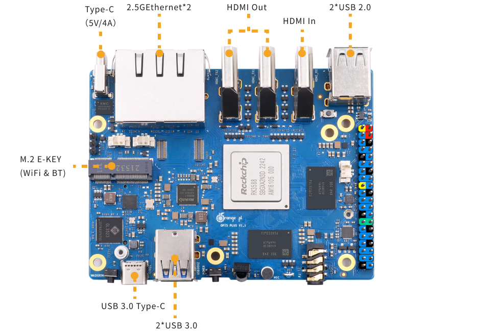 — Процессор : Rockchip RK3588 (8 нм, 8-ядерный 64-битный, 4× Cortex-A76 2.4 ГГц + 4× Cortex-A55 1.8 ГГц) — Графика : ARM Mali-G610 с 3D ускорением, поддержка OpenGL ES 1.1 / 2.0 / 3.2, OpenCL 2.2, Vulkan 1.2 — Встроенный NPU до 6 TOPS (INT4 / INT8 / INT16 / FP16) для приложений AI — Память : 4 / 8 / 16 ГБ LPDDR4 или LPDDR4X (в версии с 32 ГБ — LPDDR4X) — Хранение : QSPI Nor Flash 16 / 32 МБ + слот microSD до 128 ГБ + разъём eMMC для модулей 16 / 32 / 64 / 128 / 256 ГБ + M.2 слот (PCIe 3.0 x4) для NVMe SSD 2280 — Сеть : два 2.5G Ethernet-порта (RTL8125BG по PCIe) для высокоскоростной передачи данных — Поддержка Wi-Fi 6 и Bluetooth 5.3 (BLE) через слот M.2 E-Key (2230 модуль) — USB : 2 × USB 3.0 + 2 × USB 2.0 + 1 × Type-C (питание 5 В 4 А) — Видео : 2 × HDMI 2.1 (до 8K @ 60 Гц) + 1 × HDMI вход (4K @ 60 Гц) + Type-C с DP 1.4a (8K @ 30 Гц) + MIPI DSI (4 Lane) — Камера : 1 × MIPI CSI (4 Lane) — Аудио : кодек ES8388 / 3.5 мм разъём с микрофоном / MIC IN / HDMI eARC / SPK выход — GPIO : 40-контактный двухрядный разъём (UART / I²C / SPI / CAN / I²S / PDM / AUDDSM / SDIO / PWM / GPIO) — PCIe M.2 M-Key (снизу) — для NVMe SSD (PCIe 3.0 x4) 2280 — PCIe M.2 E-Key (сверху) — для модулей Wi-Fi 6 / BT (PCIe 2.0 x1 / PCM / UART / USB 2.0) — Кнопки : MaskROM / Recovery / Power — Питание : через Type-C 5 В @ 4 А — Дополнительно : ИК-приёмник / RGB-индикатор / разъём вентилятора 5 В / RTC аккумулятор (2-pin) — Операционные системы : Orange Pi OS (Droid / Arch), Ubuntu 22.04, Debian 11, Android 12 — Размер платы : 100 × 75 мм Вес : ≈ 86.5 г — Особенности : двойной 2.5G LAN, 4 независимых видеовыхода, поддержка NVMe SSD и Wi-Fi 6 / BT 5.3 — Применение : встраиваемые системы, машинное зрение, умный дом, edge и AIoT устройства |