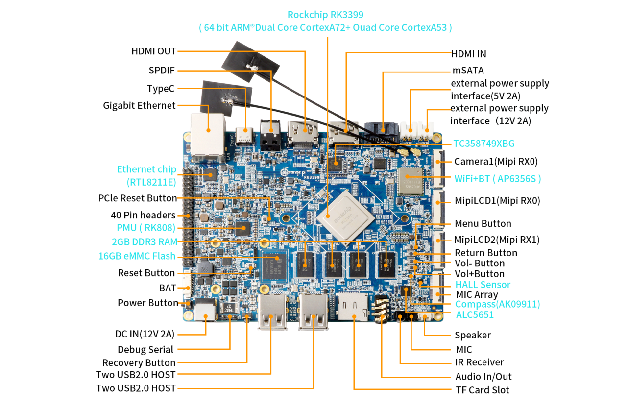 Плата оснащена 2 или 4 ГБ DDR3 оперативной памяти, встроенным накопителем 16 ГБ eMMC, гигабитным Ethernet-портом, двухдиапазонным Wi-Fi 2.4/5 ГГц и модулем Bluetooth 4.1. Orange Pi RK3399 поддерживает Android 6.0 и Debian 9 и подходит для мультимедийных систем, умных домов, образовательных и IoT-проектов. Основные характеристики — Процессор: Rockchip RK3399 (6 ядер, 2×Cortex-A72 + 4×Cortex-A53, до 2.0 ГГц) — Графика: Mali-T860 MP4, OpenGL ES 1.1/2.0/3.0/3.1, OpenVG 1.1, OpenCL, DX1 — Оперативная память: 2 / 4 ГБ DDR3 (совместно с GPU) — Встроенная память: 16 ГБ eMMC + слот MicroSD/TF (до 128 ГБ) — Сеть: Gigabit Ethernet (10/100/1000 Мбит/с, Realtek RTL8211E) — Wi-Fi: двухдиапазонный 2.4/5 ГГц 802.11 a/b/g/n/ac (2×2 MIMO) — Bluetooth: версия 4.1 (BLE) — Видео: HDMI 2.0, DisplayPort 1.2, eDP 1.3, 2×MIPI DSI, HDMI IN, до 4K@60 Гц — Камера: 2×MIPI-CSI (до 13 Мп каждая), поддержка USB-камер — Аудио: HDMI/DP, 3.5 мм комбинированный джек, SPDIF, I²S (до 8 каналов), встроенный микрофон — Датчики: гироскоп, акселерометр, компас, датчики света и Холла — Питание: DC 12 В 2 А (разъём 5.5×2.1 мм) или Type-C 5 В 3 А, поддержка батареи 7.4 В — Интерфейсы: 4×USB 2.0, 1×USB 3.0 Type-C, miniPCIe (LTE/mSATA), слот SIM, 40-пиновый GPIO — Размеры: 129 × 99 мм — Вес: ≈ 99 г — ОС: Android 6.0, Debian 9 Особенности • 16 ГБ встроенной eMMC — быстрая загрузка и высокая надёжность • Шестиядерный процессор RK3399 — оптимальный баланс мощности и энергоэффективности • Поддержка 4K-видео и нескольких дисплеев (HDMI, DP, eDP, MIPI) • Расширяемость через miniPCIe, mSATA, SIM-слот и GPIO • Встроенные Wi-Fi и Bluetooth 4.1 без необходимости дополнительных модулей • Полная совместимость с Android и Debian Интерфейсы — HDMI 2.0 (4K@60 Гц) — DisplayPort 1.2 — eDP 1.3 — 2×MIPI DSI — 4×USB 2.0 — 1×USB 3.0 Type-C — 40-пиновый GPIO (UART, I²C, SPI, PWM) — miniPCIe (LTE/mSATA) — Слот MicroSD/TF — Слот SIM — Разъём питания DC 12 В / Type-C 5 В — Аудио 3.5 мм и SPDIF — Gigabit Ethernet RJ-45 — Модули Wi-Fi 2.4/5 ГГц и Bluetooth 4.1 Возможные применения • Мини-ПК и медиаплееры • Системы «умного дома» и видеонаблюдения • NAS-серверы и сетевые устройства • Робототехника и IoT-контроллеры • Обучающие и инженерные платформы • Промышленные и встраиваемые решения |