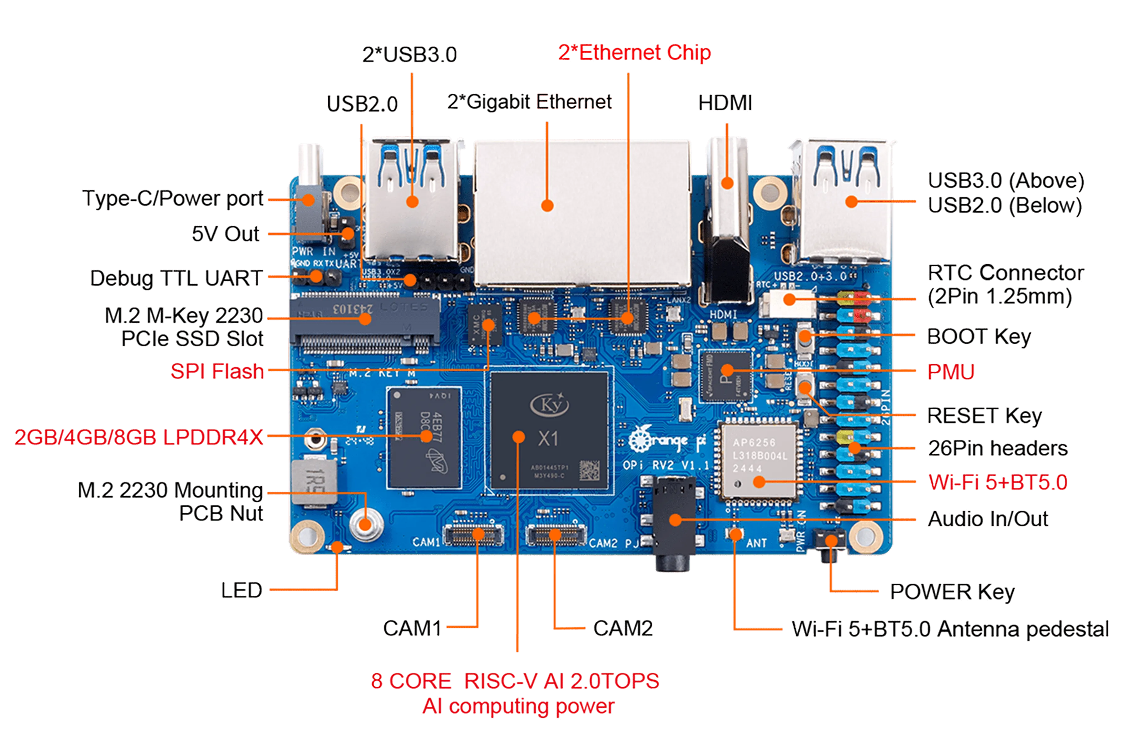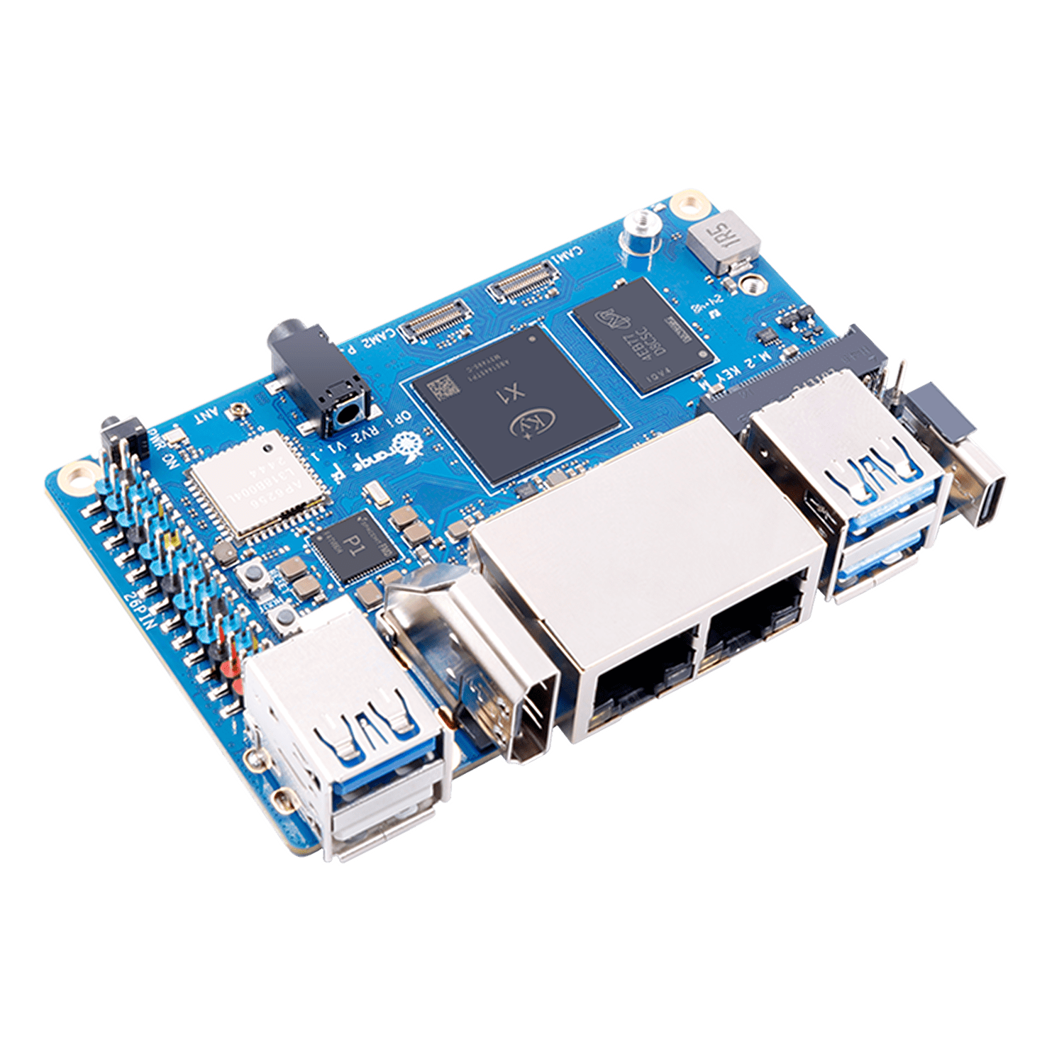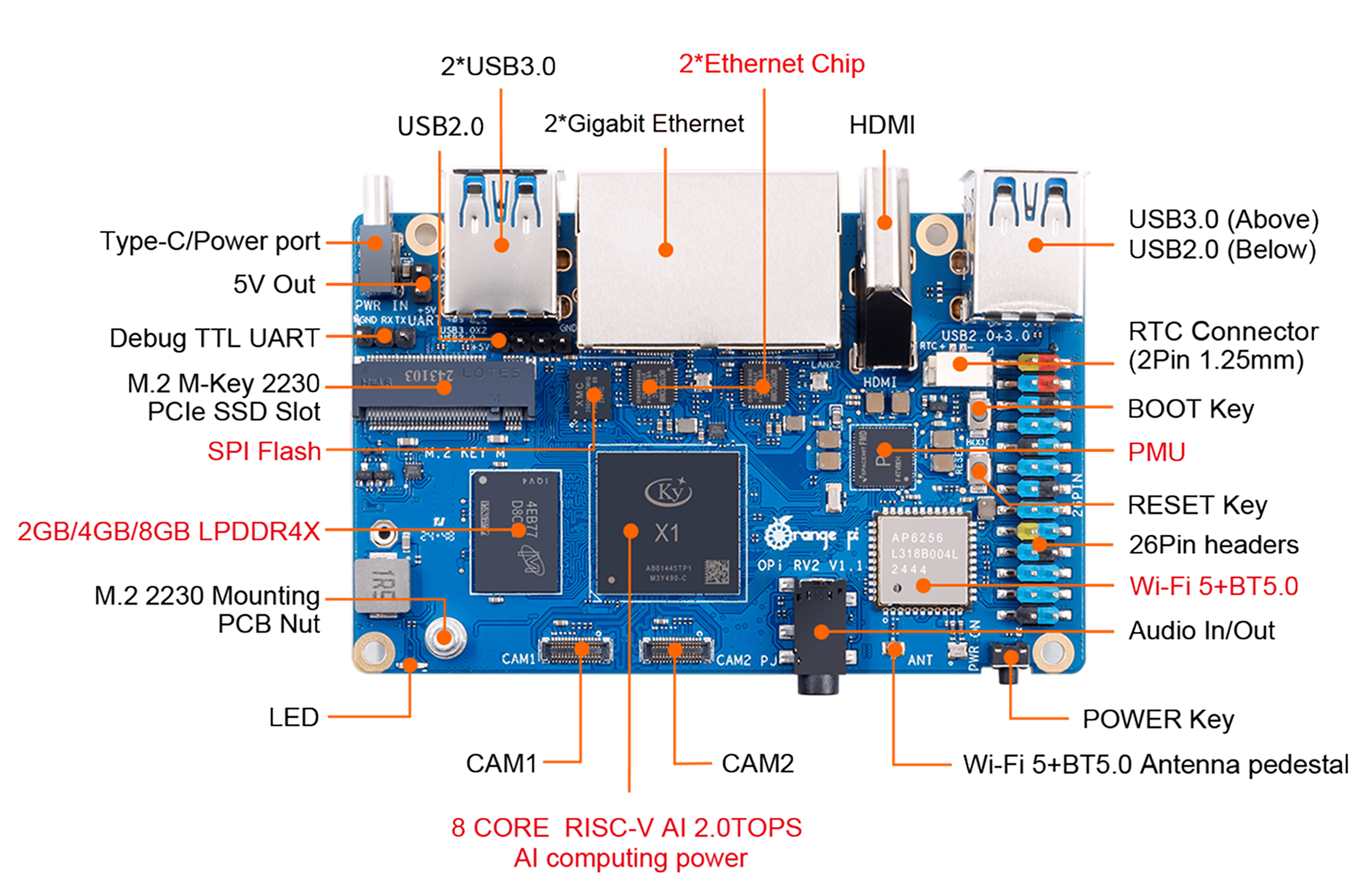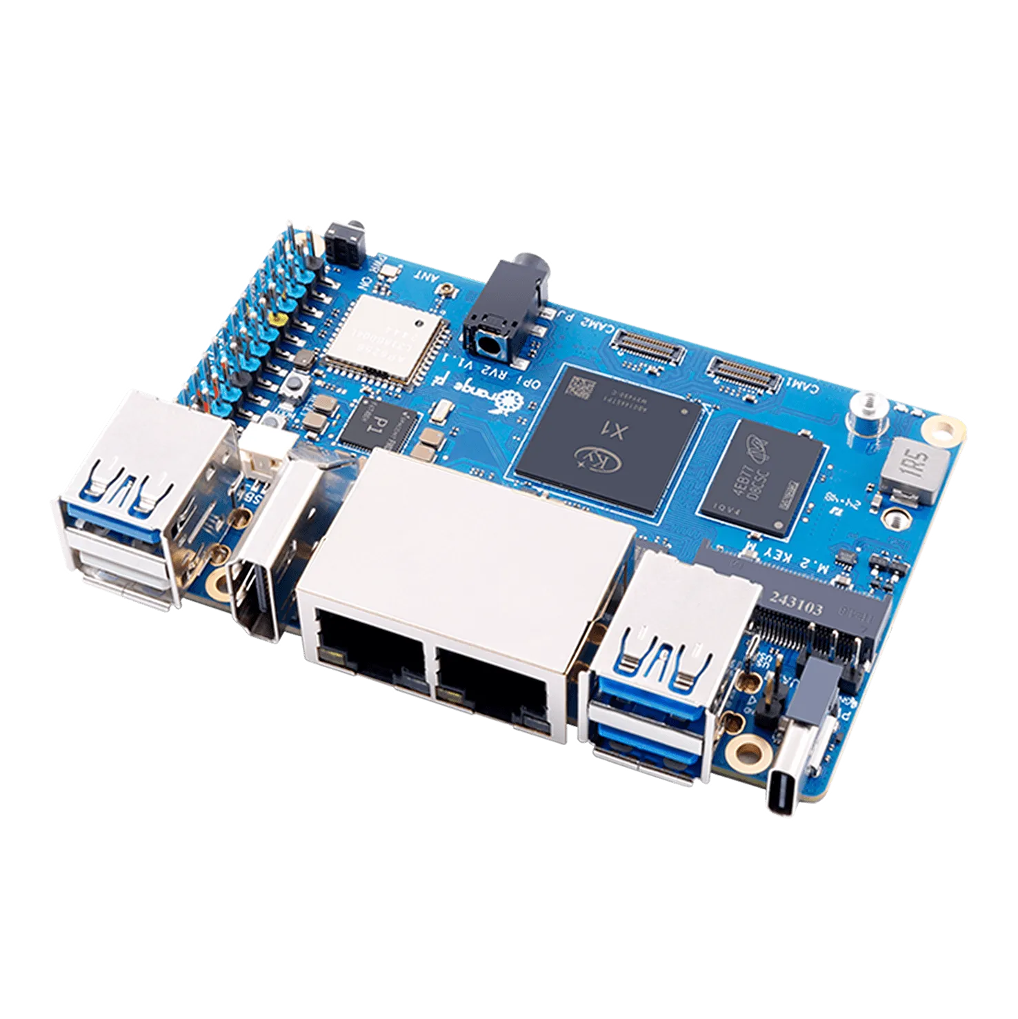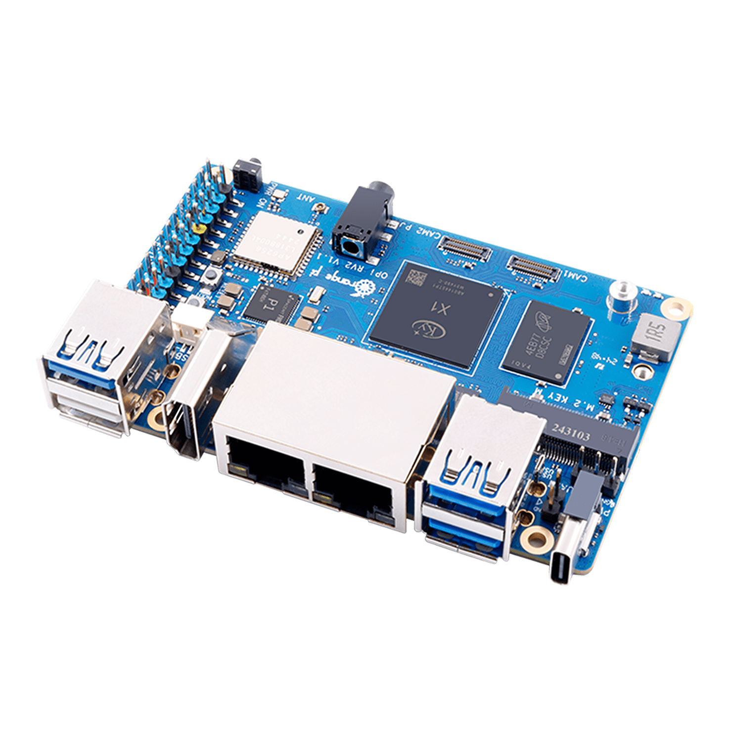 Плата обеспечивает вычислительную мощность 2 TOPS без необходимости в отдельном NPU-модуле и поддерживает быстрое развёртывание AI-моделей. Оснащена 2 / 4 / 8 ГБ оперативной памяти LPDDR4X, двумя гигабитными LAN-портами, модулями Wi-Fi 5.0 + Bluetooth 5.0 (BLE), а также двумя слотами M.2 M-Key для NVMe SSD.