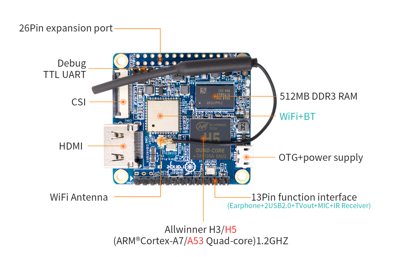 Плата размером 46×48 мм с процессором Allwinner H3 / H5, 512 МБ DDR3 и встроенной памятью eMMC 8 ГБ. Оснащена Wi-Fi + BT 4.2, CSI-портом и HDMI-выходом.