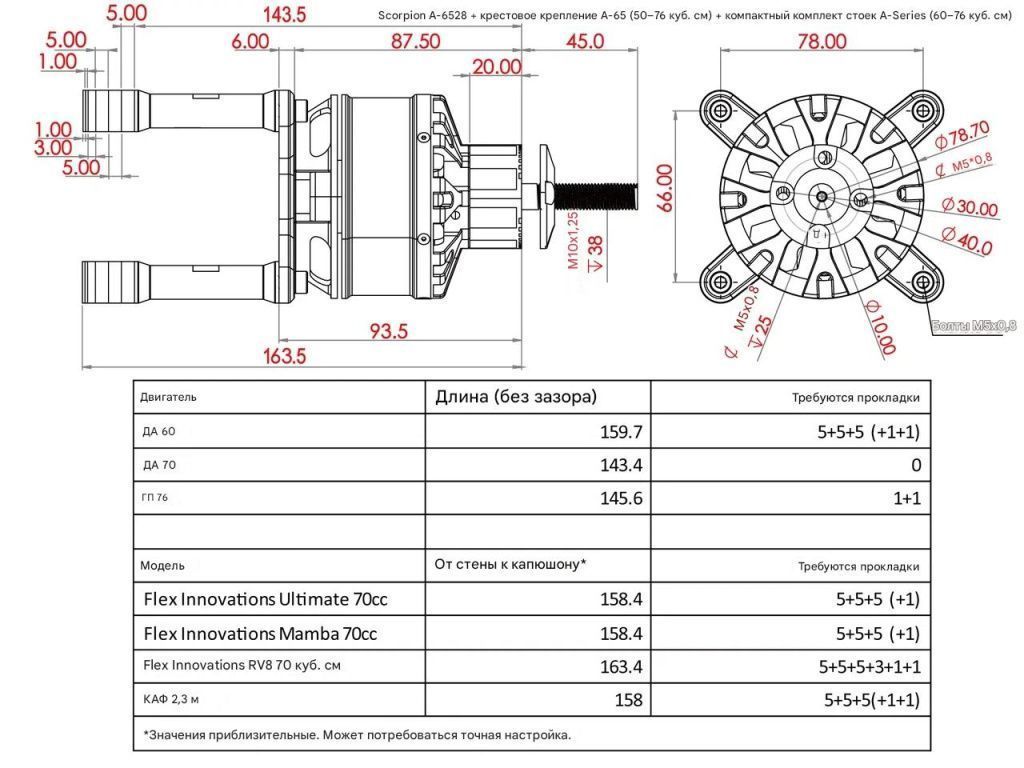 Модель A-6528 PNP Combo (12S) предназначена для акробатических самолётов с размахом 85–95 дюймов и дронов, требующих до 6000 Вт мощности. По характеристикам эквивалентен бензиновому двигателю 60–76 cc:
