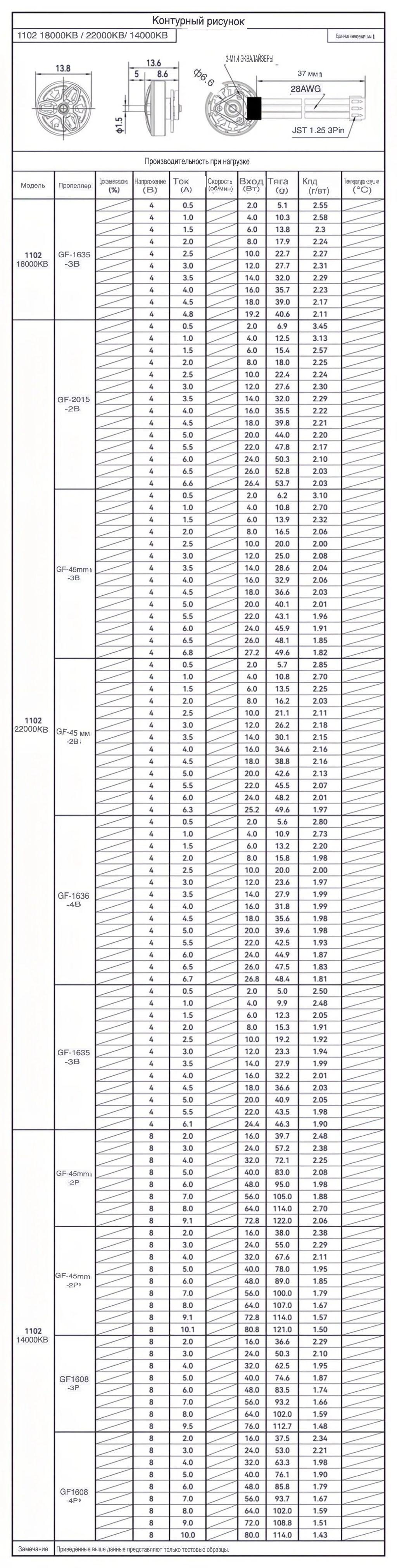 Бесколлекторный двигатель 1102 22000KV — это высокооборотистая версия для пилотов, которым нужна максимальная отзывчивость и "пыр" для агрессивных гонок на 1S whoop-дронах. Обладая меньшим весом (2.79 г) и более высокими оборотами, он обеспечивает резкий набор тяги на низких значениях газа, что позволяет дрону быстрее разгоняться и выполнять резкие манёвры. Это идеальный выбор для апгрейда стандартных платформ и участия в динамичных indoor-соревнованиях. Общие характеристики — Тип: Бесколлекторный двигатель (BLDC) внешнего вращения — Модель: 1102 (диаметр статора 11 мм, высота 2 мм) — Постоянная скорости (KV): 22000 об/мин/В — Назначение: Агрессивные гоночные 1S whoop-дроны 75 мм — Ключевое преимущество: Максимальная динамика, отзывчивость и тяга на низком газе — Номинальное рабочее напряжение: 1S LiPo — Конструкция: Шарикоподшипники, динамическая балансировка, провода припаяны к PCB — Особенность: Поставляется в черном или синем цвете (в зависимости от выбора) Ключевые особенности — Агрессивная динамика для гонок: Повышенное значение KV обеспечивает более резкую реакцию на команды газа ("punch"), критичную для обгонов. — Лёгкость для маневренности: Вес 2.79 г делает его легче версии 18000KV, положительно влияя на акселерацию и общую agility дрона. — Улучшенный апгрейд: Является рекомендуемым выбором для модернизации дронов, оснащённых моторами 18000KV, для придания им спортивного характера. — Мощная тяга: В паре с пропеллером GF-1635-3B развивает тягу до 46.3 г (на ~14% больше, чем 18000KV). Технические характеристики — Вес: 2.79 г — Высота (ориентировочно): ~13.6 мм (версия 2022) — Диаметр вала: 1.5 мм — Длина вала: 5 мм — Шаг крепёжных отверстий: 3 отверстия M1.4 на окружности Ø6.6 мм — Длина проводов: 28 AWG — Разъём: Micro JST-1.25 3-pin Производительность (ориентировочно, с пропеллером GF-1635-3B) — Максимальная тяга: 46.3 г — Эффективность на пике: 1.90 г/Вт (немного ниже, чем у 18000KV, из-за большей мощности) — Применение: Агрессивные гонки, динамичный фристайл. Область применения — Соревновательные 1S whoop-дроны 75 мм для indoor-гонов. — Апгрейд Meteor75, Cetus Pro и аналогичных дронов для увеличения динамики. — Проекты, где приоритетом является максимальная отзывчивость, а не абсолютная эффективность. Комплектация (на 4 мотора) — Двигатели 1102 22000KV ×4 — Комплект винтов M1.4x4 мм ×1 (достаточно для крепления) Варианты исполнения (доступные опции) Двигатель 22000KV доступен для выбора в двух цветах: — Чёрный (Black) — Синий (Blue) Конкретный цвет, а также длина кабеля (вероятно, 37 мм для версии 2022) уточняются при выборе опции и запросе коммерческого предложения (КП). |