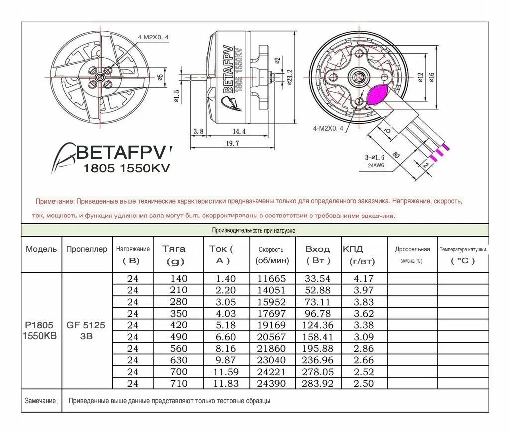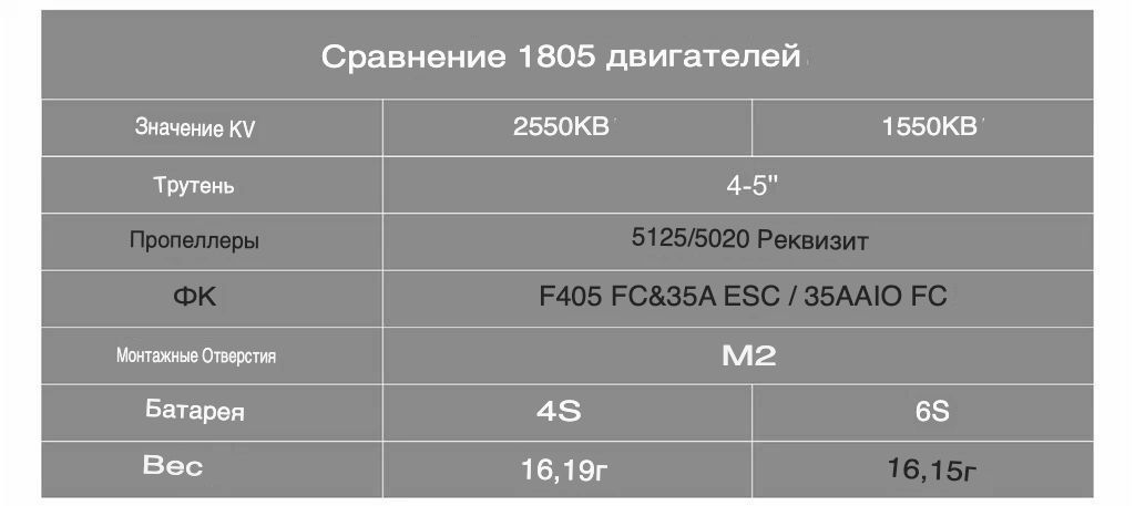 1805 1550KV — это высокоэффективный бесколлекторный двигатель для 4-5 дюймовых гоночных и фристайл-дронов, оптимизированный для работы с 6S LiPo аккумуляторами. Мотор имеет конфигурацию статора 1805 (18 мм диаметр, 5 мм высота) и скорость вращения 1550 KV, обеспечивая высокую мощность и эффективность при минимальном весе. Вес составляет всего 16.1 г, что делает его одним из самых лёгких двигателей в классе 1805. Оснащён валом диаметром 1.5 мм с отверстиями под винты M2 для фиксации пропеллеров (безрезьбовая конструкция для экономии веса). Рекомендован для использования с пропеллерами Gemfan 5125/5020, HQ 5025, полётными контроллерами на базе F405/35A ESC и 6S батареями 550 мАч 75C. Идеально подходит для рам TWIG ET5 5" и X-Knight 4". Общие характеристики — Тип: Бесколлекторный двигатель (BLDC) для гоночных и фристайл-дронов — Модель: BETAFPV 1805 1550KV — Серия: 1805 — Назначение: 4-5 дюймовые гоночные и фристайл-дроны на 6S питании — Ключевое преимущество: Высокая эффективность для 6S систем, экстремально лёгкий вес, безрезьбовой вал — Скорость вращения: 1550 KV — Напряжение питания: 6S LiPo (22.2 В) — Вес: 16.1 г — Цвет: Сине-чёрный — Диаметр вала: 1.5 мм — Длина вала: 3.8 мм — Крепление мотора: 4 × M2, межосевое расстояние 12 мм — Крепление пропеллера: 2 × M2 (безрезьбовой вал, фиксация винтами) — Длина кабеля: 80 мм — Сечение кабеля: 24 AWG — Габариты: 23.2 × 23.2 × 19.7 мм Ключевые особенности — Оптимизирован для 6S систем питания: 1550 KV обеспечивает идеальное согласование с напряжением 6S (22.2 В) для 4-5 дюймовых пропеллеров. Высокая эффективность и мощность для гоночных дисциплин. — Экстремально лёгкий вес: Всего 16.1 г на мотор — один из самых лёгких двигателей в классе 1805. Критически важно для весочувствительных гоночных сборок. — Безрезьбовой вал для экономии веса: Вал диаметром 1.5 мм не имеет резьбы, фиксация пропеллеров осуществляется двумя винтами M2. Позволяет сэкономить дополнительные граммы по сравнению с традиционными цанговыми или гаечными креплениями. — Идеальная пара с Gemfan 5125: Оптимизирован для работы с трёхлопастными пропеллерами Gemfan 5125, обеспечивая минимальный шум и потери мощности при максимальной эффективности. — Рекомендованные компоненты: Рекомендуется использовать с полётными контроллерами F405 + 35A BLHeli_32 ESC или 35A AIO Brushless FC, а также с 6S батареями 550 мАч 75C. — Совместимость с рамами: Идеально подходит для 4-5 дюймовых рам, особенно для TWIG ET5 5" Toothpick Frame и X-Knight 4" FPV. Технические характеристики — Конфигурация: 1805 (18×5 мм) — KV: 1550 об/мин/В — Напряжение: 6S (22.2 В) — Вес: 16.1 г — Диаметр вала: 1.5 мм — Длина вала: 3.8 мм — Крепление к раме: 4× M2, Ø12 мм — Крепление пропеллера: 2× M2 (безрезьбовое) — Кабель: 24 AWG, 80 мм — Габариты: 23.2 × 23.2 × 19.7 мм — Цвет: Сине-чёрный Рекомендуемые компоненты — Полётный контроллер: F405 Flight Controller + 35A BLHeli_32 ESC, 35A AIO Brushless FC — Пропеллеры: Gemfan 5125 3-Blade, Gemfan 5020, HQ 5025 3-Blade — Аккумулятор: 550 мАч 6S 75C — Рама: 4-5 дюймов, TWIG ET5 5" Toothpick Frame, X-Knight 4" FPV Область применения — 4-5 дюймовые гоночные дроны на 6S питании. — Высокоскоростные Toothpick-сборки (TWIG ET5, X-Knight 4"). — Фристайл-полёты с высокими требованиями к мощности и эффективности. — Соревновательные дисциплины, требующие лёгких и мощных моторов. Комплектация поставки — Вариант 1 (1pc): Мотор 1805 1550KV — 1 шт., комплект винтов M2 — 1 уп. — Вариант 2 (4pcs): Моторы 1805 1550KV — 4 шт., комплект винтов M2 — 1 уп. Варианты исполнения (доступные опции) — Количество: 1 шт. или 4 шт. — KV: 1550KV (только для 6S) — Длина кабеля: 8