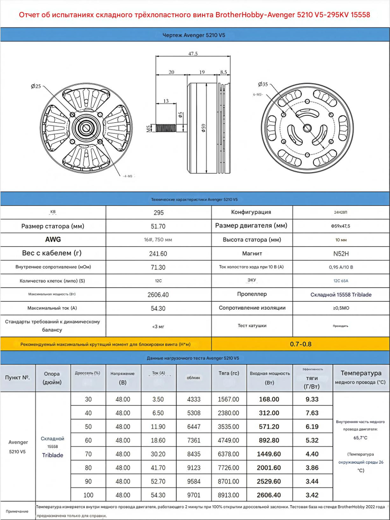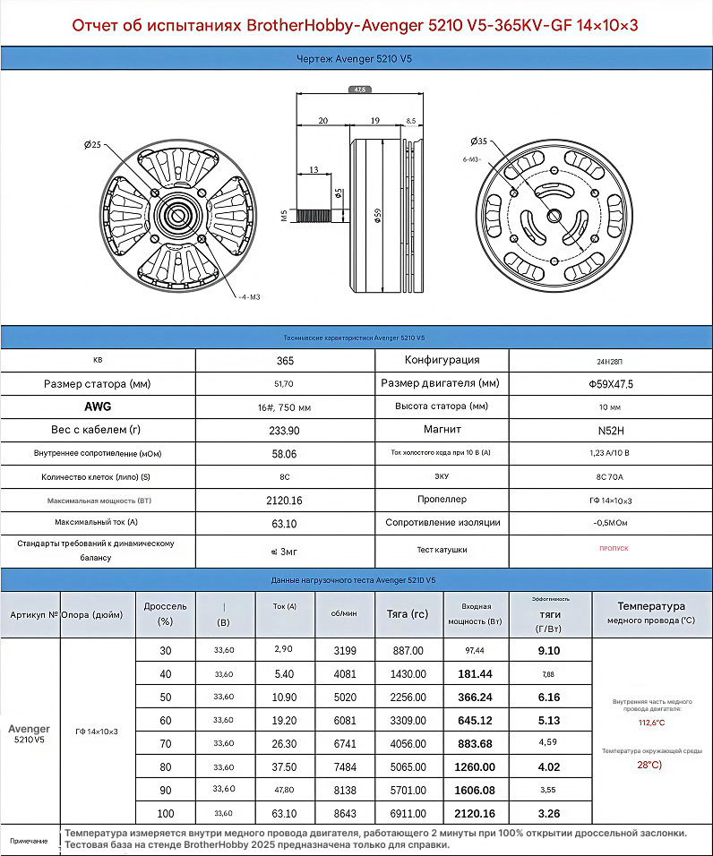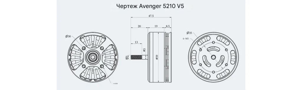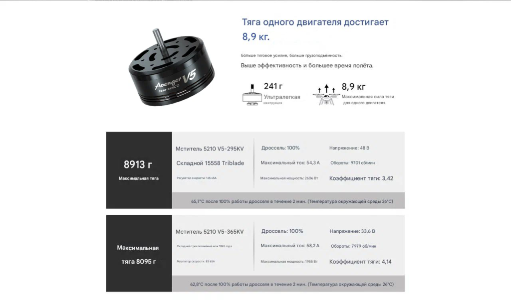 Avenger 5210 V5 — мощный, стабильный и энергоэффективный двигатель для тяжёлых коптеров, обеспечивающий тягу до 8,9 кг и идеальный баланс мощности и надёжности для профессионального применения.