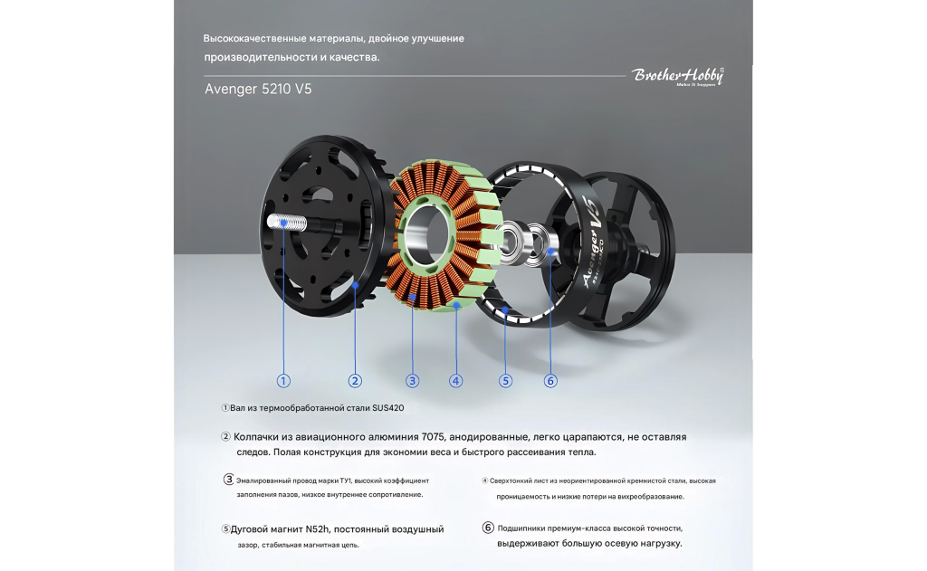 BrotherHobby Avenger 5210 V5 — двигатель повышенного класса для профессиональных мультикоптеров и аэросъёмочных систем.