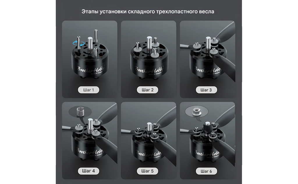 — Рекомендуемый момент затяжки пропеллера: 0,7–0,8 Н·м