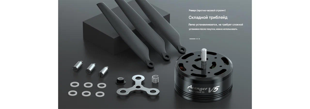 Совместим с аккумуляторами 12–14S LiPo и складными трёхлопастными винтами до 18 дюймов.