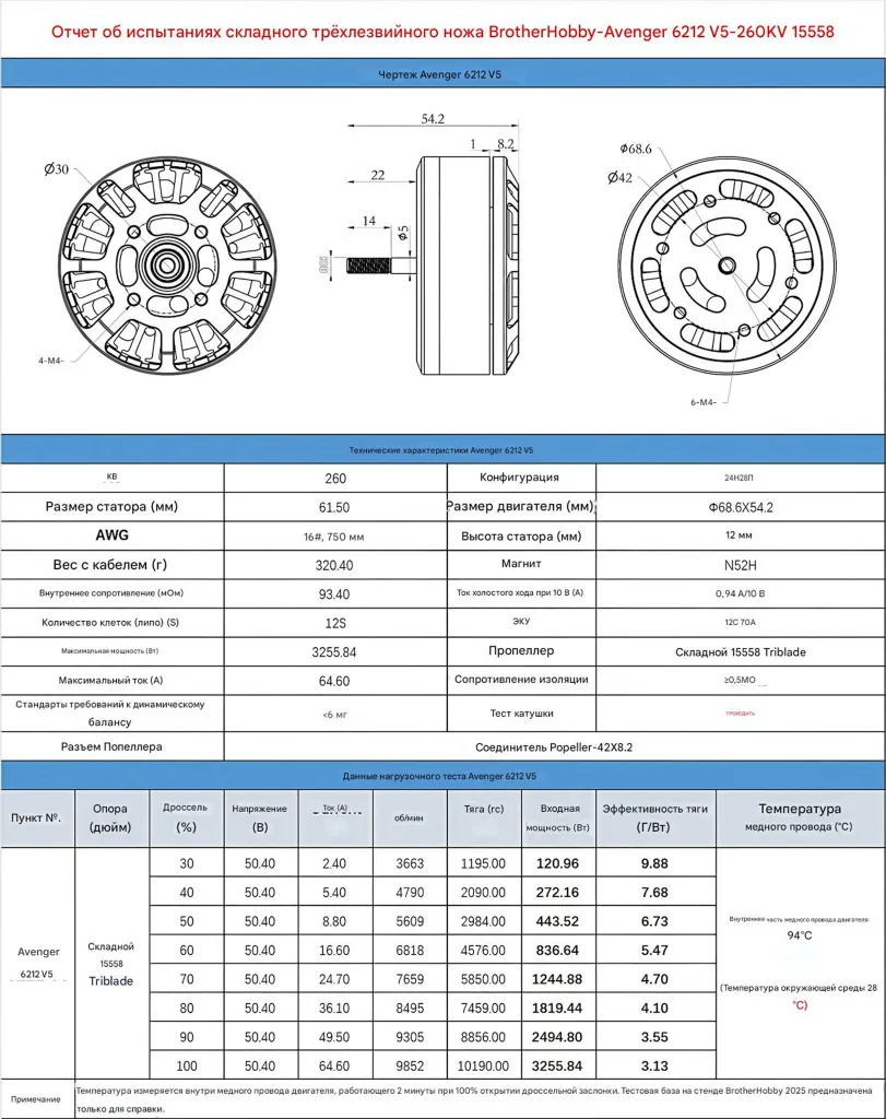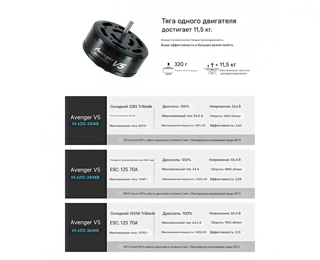 Avenger 6212 V5 — высокоэффективный двигатель с максимальной тягой до 11,5 кг, разработанный для профессиональных беспилотных систем, требующих надёжности, стабильности и высокой мощности.