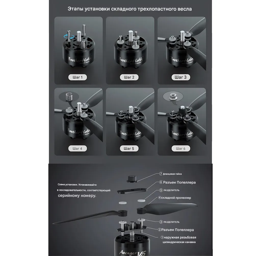— Рекомендуемый момент затяжки пропеллера: 0,7–0,8 Н·м