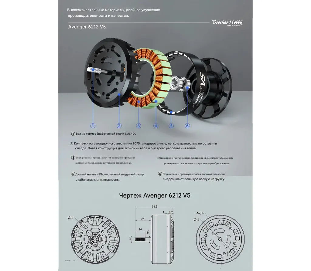 BrotherHobby Avenger 6212 V5 — мощный двигатель для тяжёлых коптеров, киносъёмочных платформ и промышленных UAV.