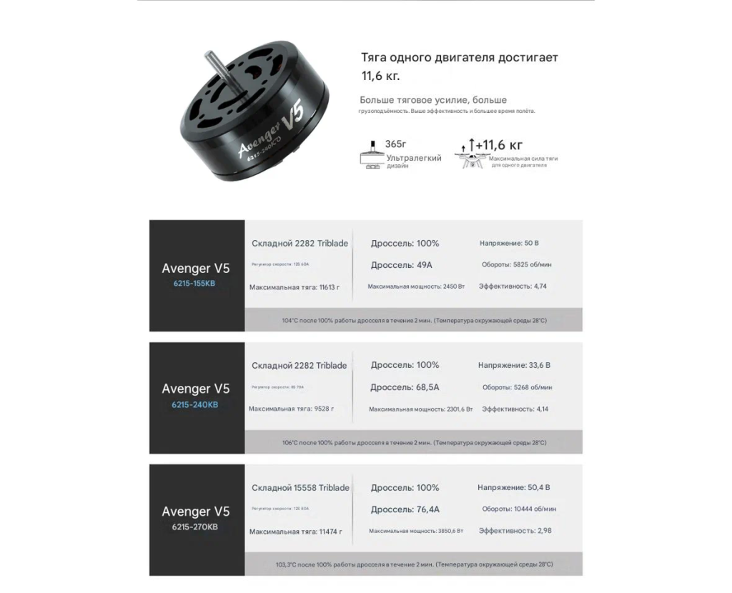 Avenger 6215 V5 — двигатель с выдающейся тягой и энергоэффективностью, созданный для тяжёлых коптеров, аэросъёмочных систем и профессиональных промышленных применений.