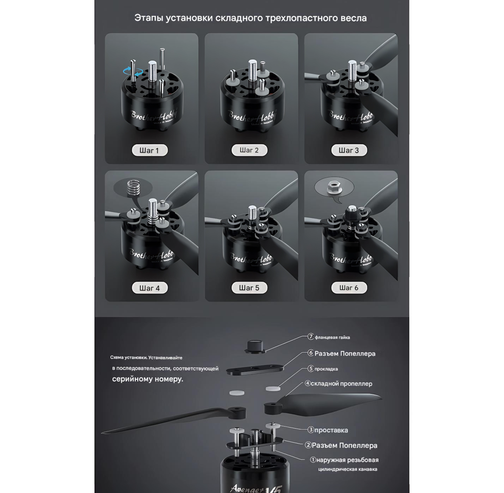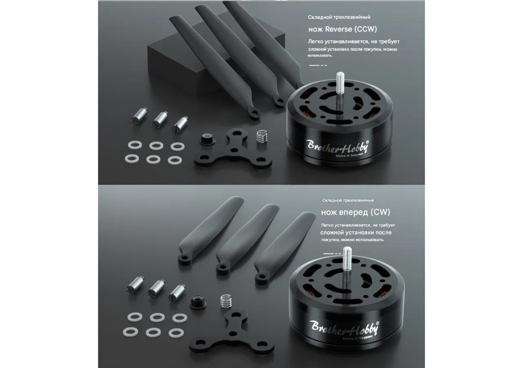 Поддерживает аккумуляторы 12S LiPo и совместим со складными трёхлопастными пропеллерами диаметром до 22 дюймов.
