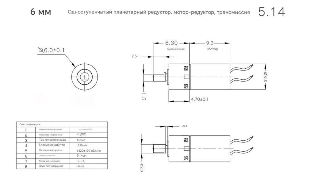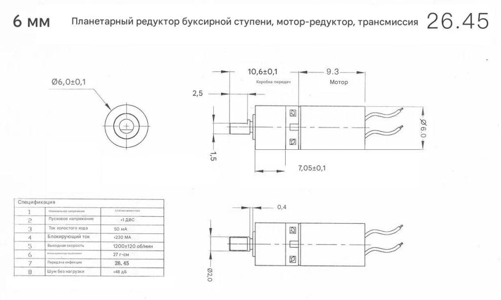 Щёточный микродвигатель 6×19 мм (с пластиковым валом) Описание Компактный щёточный микродвигатель диаметром 6 мм и длиной 19 мм, оснащён пластиковым валом. Подходит для использования в моделях, игрушках, робототехнике, мини-механизмах и других малогабаритных электронных устройствах. Обеспечивает стабильную работу при небольших нагрузках, отличается надёжностью и долговечностью. Особенности — 100% новый двигатель с высокой точностью изготовления. — Высокая жёсткость и точность вращения. — Коэффициент передачи одной ступени — 97–98%. — Высокое соотношение крутящего момента к объёму. — Обычно используется со шаговыми и серво-моторами для снижения оборотов и увеличения крутящего момента. — Корпус устойчив к коррозии, рассчитан на длительный срок службы. — Стабильные характеристики, низкий уровень шума, высокая нагрузочная способность. — Устойчив к износу, перегреву и механическим воздействиям. Технические характеристики — Тип: щёточный микродвигатель (brushed DC motor) — Диаметр корпуса: 6 мм — Длина: 19 мм — Вал: пластиковый, осевой — Материал корпуса: металл и пластик — Назначение: для микро-устройств и моделей — Рабочие параметры: зависят от модели (напряжение и скорость уточняются в спецификации партии) Примечания — Возможны небольшие отклонения в цвете изделия, вызванные освещением и настройками монитора. — Допустимы незначительные погрешности ручных измерений. |