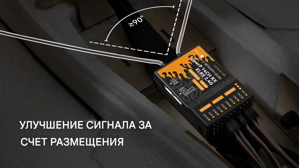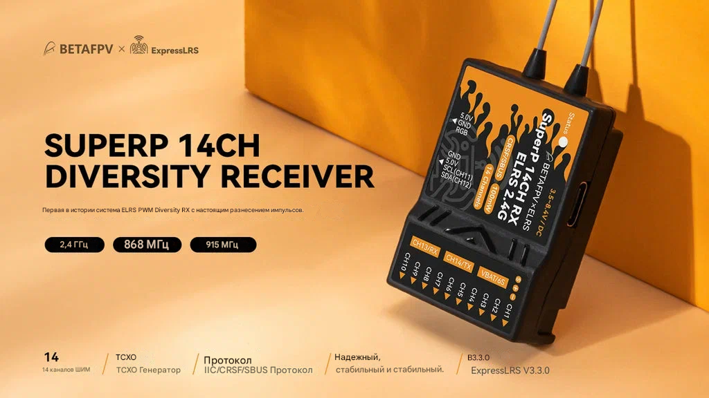 BETAFPV SuperP 14CH Diversity Receiver — это профессиональный приёмник с истинным разнесением (true diversity) на базе протокола ExpressLRS, работающий в диапазоне 2.4 ГГц. Оснащён двумя независимыми RF-цепями на чипах SX1280/SX1281 с усилителями AT2401C, двумя антеннами с разъёмами U.FL и высокоточным термокомпенсированным кварцевым генератором (TCXO). Поддерживает 14 PWM-каналов для управления сервоприводами, а также CRSF и SBUS. Имеет порты для подключения внешних датчиков (барометр, датчик тока, RGB-лента) по I2C. Предназначен для длительных полётов, аэросъёмки, фиксированных крыльев, вертолётов, RC-автомобилей и лодок. Общие характеристики — Тип: Приёмник с истинным разнесением (True Diversity) — Модель: BETAFPV SuperP 14CH Diversity Receiver (ELRS 2.4GHz) — Частотный диапазон: 2.4 ГГц ISM — Назначение: Управление сложными RC-моделями, требующими высокой надёжности связи и множества PWM-каналов — Ключевое преимущество: Две полные RF-цепи, TCXO, 14 PWM-каналов, поддержка внешних датчиков — Протокол: ExpressLRS — Микроконтроллер: ESP32 Pico D4 — RF-чипы: 2 × SX1280/SX1281 — Усилители: 2 × AT2401C (PA + LNA) — Мощность телеметрии: 20 дБм / 100 мВт — Выходные протоколы: PWM, CRSF, SBUS — Количество PWM-каналов: 14 — Антенны: 2 × U.FL (в комплекте монопольные антенны 150 мм) — Генератор: TCXO (термокомпенсированный), общий для двух RF-чипов — Напряжение питания: 3.5–8.4 В — Ток потребления: 180 мА @ 5 В — Детектор напряжения батареи: 1–6S — Вес: 15.5 г — Габариты: 46.9 × 32.7 × 14.6 мм — Версия прошивки с завода: ExpressLRS V3.3.0 Ключевые особенности — Истинное разнесение (True Diversity): Две полностью независимые приёмные цепи с собственными RF-чипами и усилителями обеспечивают непрерывный приём сигнала даже при затенении одной из антенн. Критически важно для полётов в условиях сложной многолучевой интерференции. — 14 PWM-каналов: Позволяет управлять до 14 сервоприводами одновременно, что делает приёмник идеальным выбором для сложных фиксированных крыльев, вертолётов и наземных моделей с множеством функций. — TCXO для стабильности частоты: Термокомпенсированный кварцевый генератор обеспечивает исключительную точность частоты в широком диапазоне температур. Гарантирует стабильную связь на предельных дистанциях как в условиях жары, так и холода. — Расширяемость через I2C: Встроенный I2C-порт позволяет подключать внешние сенсоры: барометр (SPL06), датчик тока, RGB-светодиодные ленты и другие устройства, находящиеся в разработке. — Гибкость выходных протоколов: Настраивается на PWM, CRSF или SBUS через веб-интерфейс. Каждый канал может быть индивидуально сконфигурирован под частоту PWM (50–400 Гц), 10кГц Duty, ON/OFF, последовательные протоколы. — Удобная настройка и обновление: Встроенный порт USB Type-C и WiFi-интерфейс для конфигурации через браузер. Не требует дополнительных программаторов. Технические характеристики (2.4GHz) — Частотный диапазон: 2400–2480 МГц — RF-чипы: 2 × SX1280/SX1281 — Усилители: 2 × AT2401C (PA + LNA) — Мощность телеметрии: 100 мВт (20 дБм) — Ток потребления: 180 мА @ 5 В — Вес: 15.5 г — Антенны в комплекте: 2 × монопольные антенны, длина 150 мм, разъём U.FL — Поддерживаемые частоты пакетов: LoRa, FLRC, DVDA (индикация цветом RGB) Область применения — Дальние полёты (Long Range) FPV-дронов в диапазоне 2.4 ГГц. — Фиксированные крылья (самолёты) с большим количеством сервоприводов. — Вертолёты, RC-автомобили, RC-лодки, требующие надёжного разнесённого приёма. — Аэросъёмка и профессиональные миссии, где критична стабильность канала управления. — Проекты, тр