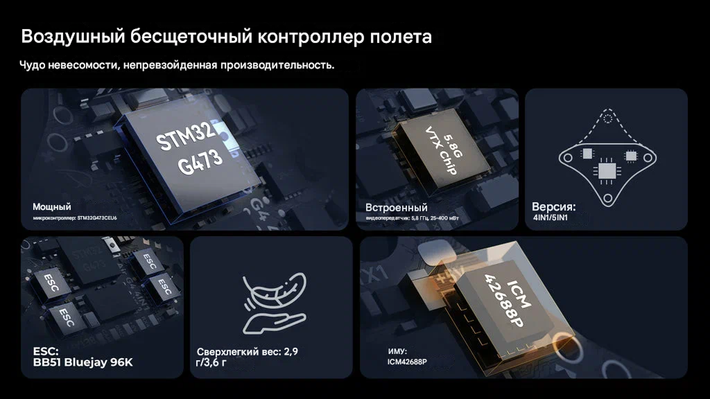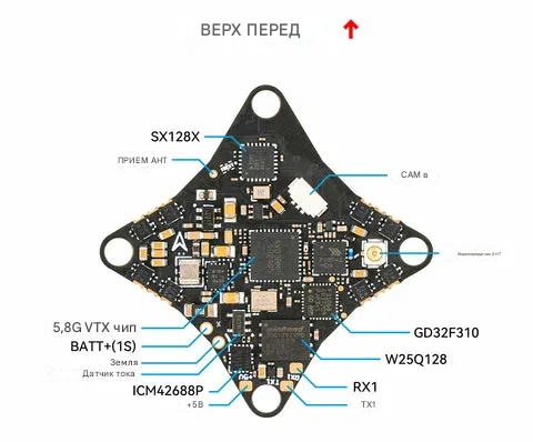 Максимально интегрированная высокопроизводительная плата для 1S дронов, созданная для опытных пилотов. Объединяет процессор STM32G473, VTX 25–400 мВт, OSD, ESC 5A и встроенный приемник Serial ELRS 2.4G. Ультратонкий (0.8 мм) и легкий (3.6 г) дизайн для гонок и фристайла. Внимание Контроллер разработан для продвинутых пилотов, стремящихся к максимальной производительности и минимальному весу. Для новичков рекомендуется более прочный и простой в установке Matrix 1S Brushless FC. Ключевые особенности — Полная интеграция (5IN1): FC + ESC + OSD + VTX + Serial ELRS 2.4G RX. — Процессор: STM32G473CEU6 (168 МГц) — на 55% быстрее STM32F411. — Облегченная конструкция: Толщина платы 0.8 мм, вес 3.6 г. — Высококачественный гироскоп: ICM42688P с подключением по SPI и частотой опроса до 8 кГц. — Встроенный видеопередатчик: 5.8 ГГц VTX, 48 каналов, мощность 25/100/200/400 мВт/PIT, управление по SmartAudio 2.0. — Встроенный приемник: Serial ELRS 2.4G RX (прошивка V3.4.3, протокол CRSF). — Встроенный OSD: Betaflight OSD на кастомном чипе. — Мощные ESC: 5А непрерывного тока, поддержка DShot300/600. — Расширяемость: 2 свободных полнофункциональных UART-порта. — Память Blackbox: 16 МБ. Технические характеристики Компоновка (FC) — Архитектура: 5IN1 (FC + ESC + OSD + VTX + ELRS RX). — Процессор: STM32G473CEU6 (168 МГц). — Гироскоп: ICM42688P (SPI). — Память Blackbox: 16 МБ. — Датчики: Напряжение и ток. — BEC: 5В, 3А. — OSD: Betaflight OSD (кастомный чип). — Приемник: Serial ELRS 2.4G (CRSF), прошивка V3.4.3. — Прошивка FC: Betaflight_4.5.0_BETAFPVG473. — Разъем USB: SH1.0-4Pin. — Подключение моторов: Только пайка. — Разъем аккумулятора: BT2.0 (через кабель 40 мм в комплекте). — Посадочный размер: 26мм x 26мм. — Вес: 3.6 г. Видеопередатчик (VTX) — Диапазон: 5.8 ГГц, 48 каналов (включая Raceband: 5658–5917 МГц). — Выходная мощность: 25 / 100 / 200 / 400 мВт, режим PIT. — Управление: SmartAudio 2.0. — Выходное сопротивление: 50 Ом. Регуляторы (ESC) — Входное питание: Только 1S. — Ток: 5А непрерывный, пиковый 8А. — Прошивка: Bluejay A_X_5_96KHz_V0.19.hex для BB51. — Протоколы: DShot300, DShot600. Распиновка и порты (UART) — UART1: Свободный полнофункциональный порт. — UART2: По умолчанию занят встроенным VTX (SmartAudio). — UART3: Занят встроенным приемником Serial ELRS RX. — UART4: Свободный полнофункциональный порт. Настройка и обновление — Привязка ELRS: Троекратное подключение/отключение питания переводит приемник в режим привязки (двойное быстрое мигание светодиода). — Обновление прошивки ELRS: Через Wi-Fi или Betaflight Serial Passthrough. — Прошивка Betaflight: Используйте версию 4.5.0 и файл Betaflight_4.5.0_BETAFPVG473. — Прошивка ESC (Bluejay): Используйте файл A_X_5_96KHz_V0.19.hex. Избегайте коротких интервалов между попытками прошивки. Важные предупреждения — Нагрев VTX: Высокая мощность VTX сокращает время полета. Для помещений рекомендуется 25–100 мВт. — Пайка моторов: Поддерживается только пайка. Температура паяльника не выше 370°C, время контакта 1–2 секунды. — Антенна VTX: Всегда подключайте антенну ДО включения питания или установите мощность VTX в 0 мВт. Рекомендуемые компоненты — Дроны/рамы: Air65, Air75. — Моторы: 0702/0702SE, 0802/0802SE, 1102 (1S). Комплектация (версия 5IN1) — 1 x Полетный контроллер Air Brushless (5IN1). — 1 x Антенна 2.4 ГГц для приемника ELRS. — 1 x Антенна 5.8 ГГц для VTX. — 1 x Адаптер Type-C на SH1.0. — 1 x Кабель-адаптер SH1.0-4Pin. — 1 x Силовой кабель 40 мм с разъемом BT2.0. — 4 x Винта M1.4*4. — 4 x Демпфера. |