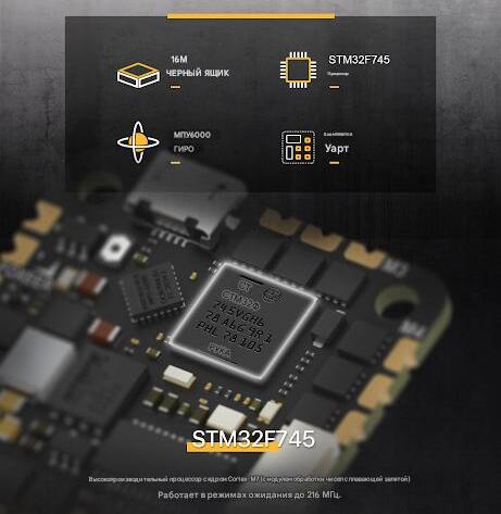 Компактная интегральная плата четвертого поколения формата «всё в одном» (AIO), объединяющая высокопроизводительный полётный контроллер и 4-в-1 регулятор оборотов. Предназначена для гоночных дронов, микро-коптеров и специализированных БПЛА с питанием 2-4S. Плата построена на мощном процессоре STM32F745 (Cortex-M7) с гироскопом MPU6000 (SPI), оснащена 16 Мб памятью для чёрного ящика, 5 портами UART и 8-пиновым разъёмом для прямого подключения цифровых систем DJI / Caddx Vista. 4-в-1 регулятор на 35A с поддержкой протокола Bluejay обеспечивает плавную и надёжную работу.