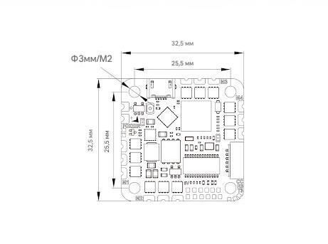 — Посадочные отверстия: 25.5 x 25.5 мм, диаметр 3 мм / резьба M2