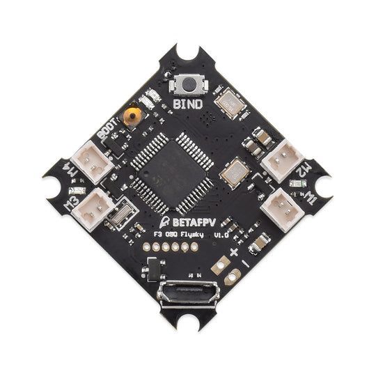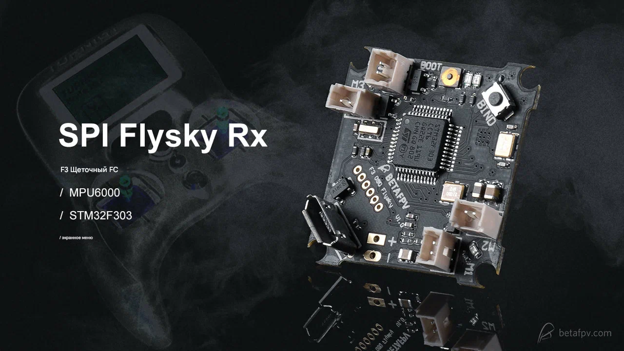 F3 Brushed Flight Controller (Flysky Rx + OSD V1) — это специализированная версия полётного контроллера для brushed Whoop-дронов, оснащённая встроенным SPI Flysky-приёмником с поддержкой протокола AFHDS 2A. Контроллер построен на процессоре STM32F303 с гироскопом MPU6000, интегрированным Betaflight OSD и предустановленной прошивкой Betaflight (таргет CRAZYBEEF3FS). Разработан для микро-дронов с коллекторными моторами на базе рамы Inductrix или Beta75. Поставлялся с предварительно припаянным силовым кабелем JST-PH 2.0 (PowerWhoop). Являлся первым решением BETAFPV для сообщества пилотов, использующих аппаратуру Flysky. Общие характеристики — Тип: Полётный контроллер для brushed Whoop-дронов — Модель: BETAFPV F3 Brushed Flight Controller (Flysky Rx + OSD V1) — Статус: Снята с производства — Рекомендуемая альтернатива: F4 Brushed Flight Controller (Frsky Rx + OSD) — Назначение: Управление микро-дронами класса Whoop с коллекторными моторами для пилотов, использующих аппаратуру Flysky — Ключевое преимущество (историческое): Первый контроллер BETAFPV со встроенным Flysky-приёмником (AFHDS 2A) и Betaflight OSD — Процессор: STM32F303 — Гироскоп: MPU6000 (Six-Axis) — Прошивка: Betaflight (таргет CRAZYBEEF3FS), предустановлена — OSD: Встроенный Betaflight OSD (управление через SPI DMA) — Приёмник: Встроенный SPI Flysky, протокол AFHDS 2A — ESC: Интегрированные FET-ключи, макс. ток 6.3 А — Поддержка моторов: 6×15 мм, 7×20 мм, 8×20 мм, 8.5×20 мм и аналогичные brushed-моторы — Размер платы: 26 × 26 мм — Крепление: Совместимо с рамой Inductrix и другими 26 мм монтажными паттернами — Кабель питания: 55 мм, JST-PH 2.0 (PowerWhoop), предварительно припаян — Вес: 3.7 г Ключевые особенности — Первый контроллер BETAFPV для Flysky-сообщества: Разработан специально для пилотов, использующих аппаратуру Flysky (FS-I6, FS-I6S, Turnigy Evolution и совместимые передатчики). Расширил доступность Whoop-дронов для пользователей Flysky-протокола. — Интегрированный SPI Flysky AFHDS 2A-приёмник: Встроенный приёмник с поддержкой современного протокола AFHDS 2A. Обеспечивает стабильную связь без необходимости внешнего модуля или дополнительной платы. — Полная программируемость через Betaflight: Подключение через встроенный USB-порт, возможность тонкой настройки PID, rates, фильтров и других параметров. — Встроенный Betaflight OSD: Отображение напряжения батареи и других полётных данных на FPV-экране. Возможность настройки PID и параметров через OSD-меню. — Совместимость с Z02 AIO Camera: Плата оснащена пин-коннектором, напрямую совместимым с камерой Z02 AIO — подключение без кабелей, по принципу plug and play. — Совместимость с Inductrix-рамами: Размер платы 26×26 мм и монтажные отверстия полностью совместимы со стандартными рамами Blade Inductrix и Beta75. Технические характеристики — Процессор: STM32F303 — Гироскоп: MPU6000 — ESC: FET-ключи, 6.3 А (макс.) — Прошивка: Betaflight (таргет CRAZYBEEF3FS) — OSD: Интегрированный Betaflight OSD — Приёмник: SPI Flysky AFHDS 2A — Размер: 26 × 26 мм — Вес: 3.7 г — Кабель питания: 55 мм, JST-PH 2.0 (PowerWhoop) — Совместимые рамы: Blade Inductrix (без доработок), Beta75 (без доработок), Eachine E010/E011 (с доработкой) Примечание по маркировке — Шёлкография: Нанесение обозначений «M1, M2, M3, M4» на плате выполнено с ошибкой (messed up). Необходимо сверяться со схемой подключения моторов из официального руководства. Индикация состояния — Receiver LED (Красный), снизу платы: — Быстрое мигание — режим привязки (bind mode) — Медленное мигание — нет соединения с передатчиком — Нет свечения — успешное соединение с передатчиком — Power LED (Зелёный, 2 шт), снизу платы: — Постоянное свечение — питание от батареи подано — Status LED (Синий), снизу платы: —