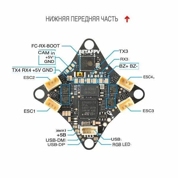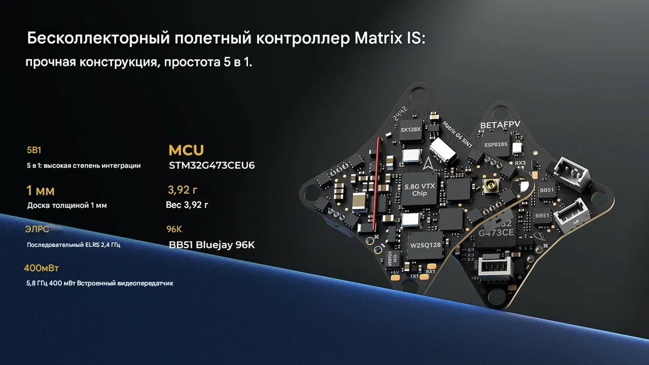 Полетный контроллер Matrix 1S 5IN1 (BMI270) — это версия популярного полностью интегрированного AIO-контроллера, оснащенная гироскопом BMI270. Сохраняя все преимущества архитектуры «5 в 1» (FC, ESC, VTX 400мВт, OSD, ELRS RX) и упрощенной сборки на разъемах, эта плата предлагает альтернативный сенсор для пилотов, ориентированных на совместимость и определенные характеристики. Как и базовая версия, она построена на усиленной 1 мм плате и процессоре STM32G473, обеспечивая надежность и повышенную производительность для аналоговых 1S whoop-дронов. Общие характеристики — Тип: AIO (All-In-One) полетный контроллер для бесколлекторных моторов — Модель: Matrix 1S Brushless Flight Controller — Версия: 5IN1 (FC + ESC + VTX + OSD + ELRS RX) — Гироскоп: BMI270 (максимальная частота опроса 3.2 кГц) — Назначение: Сборка аналоговых 1S whoop-дронов с использованием гироскопа BMI270 — Ключевая особенность: Полная интеграция компонентов и гироскоп BMI270 в усиленном корпусе — Совместимость по креплению: 26x26 мм — Целевая аудитория: Пилоты, которым требуется или предпочтителен гироскоп BMI270 — Внимание: Перед прошивкой необходимо убедиться в совместимости выбранной версии прошивки Betaflight с гироскопом BMI270. Ключевые особенности — Альтернативный гироскоп BMI270: Данная версия оснащена гироскопом BMI270, что может быть актуально для определенных сборок или при использовании специфичных версий прошивки. — Полная заводская комплектация: Как и версия с ICM42688P, включает в себя все необходимое для полета: видеопередатчик 400мВт, ELRS приемник, OSD и разъемы для моторов. — Надежность для обучения: Усиленная плата толщиной 1 мм лучше переносит удары и вибрации, характерные для первых полетов и тренировок. — Высокая вычислительная мощность: Процессор STM32G473 (168 МГц) обеспечивает быструю обработку данных для точного отклика на команды. — Простота установки: Наличие разъемов для моторов (JST1.25) исключает необходимость пайки силовых цепей, упрощая процесс сборки. Технические характеристики — Микропроцессор (MCU): STM32G473CEU6 (168 МГц, ARM Cortex-M4) — Гироскоп/Акселерометр (IMU): BMI270 (6-осевой, до 3.2 кГц) — Встроенный приемник (RX): Serial ELRS 2.4GHz (прошивка V3.4.3, протокол CRSF) — Встроенный видеопередатчик (VTX): 5.8ГГц, 48 каналов, выходная мощность: 25/100/200/400мВт, PIT-режим — Встроенный OSD: AT7456E (Betaflight OSD) — Память Blackbox: 16 МБ — ESC: 5А непрерывный, 8А пиковый (только для 1S LiPo) — Протоколы ESC: DSHOT300, DSHOT600 — BEC: 5V / 3A (максимум) — Разъем питания: BT2.0 — Разъем USB: SH1.0-4Pin (требуется переходник в комплекте) — Разъемы для моторов: JST1.25-3Pin — Порты UART: UART1 (свободный), UART2 (для VTX), UART3 (под встроенный ELRS RX), UART4 (свободный) — Габариты (ШxД): 26 x 26 мм — Толщина платы: 1.0 мм — Вес (без антенны VTX): ~3.92±0.1 г (ориентировочно) Область применения — Сборка аналоговых 1S whoop-дронов, где специфика проекта или рекомендации требуют использования гироскопа BMI270. — Для пилотов, которые приобретают плату после начала 2026 года (согласно анонсу производителя о переходе на BMI270). — Как надежное и простое решение для начинающих, где конкретный тип гироскопа не является критичным фактором. Комплектация — Плата Matrix 1S Brushless Flight Controller (5IN1, BMI270) ×1 — Адаптер Type-C на SH1.0 ×1 — Адаптерный кабель SH1.0-4Pin ×1 — Винты M1.2x4 мм (самонарезающие) ×4 — Винты M1.4x4 мм (самонарезающие) ×4 — Демпферы (противовибрационные шарики) ×4 — Примечание: Антенна VTX в комплектацию не входит. Варианты исполнения (доступные опции) Данная модель является версией с гироскопом BMI270. Также доступна 