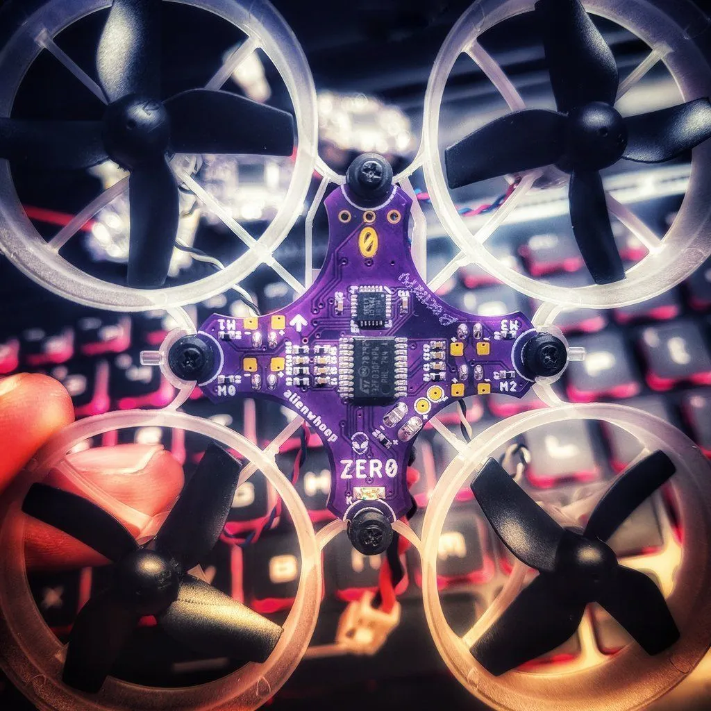 AlienWhoop ZER0 — это сверхлёгкий и отзывчивый полетный контроллер для микро-дронов на щеточных моторах, работающий на оптимизированной прошивке NotFastEnuf Silverware. Разработанный при участии топовых пилотов, он сочетает в себе минимальный вес, поддержку аккумуляторов 1S/2S и встроенный инвертер для SBUS-приемников. Плата предлагает уникальные функции, управляемые жестами с пульта: выбор фильтров моторов и поведения при низком напряжении, что позволяет тонко настроить поведение квадрокоптера под конкретные условия полёта. Общие характеристики — Тип: Полетный контроллер (FC) для щеточных моторов — Модель: AlienWhoop ZER0 Brushed Flight Controller — Прошивка: NotFastEnuf Silverware (заводская установка) — Основное назначение: Высокопроизводительные микро-дроны (whoop) для гоночных трасс и фристайла — Совместимость по креплению: Стандарт 26x26 мм (совместим с Inductrix, BetaFPV, Eachine и др.) — Ключевая особенность: Управление настройками жестами с пульта (Gesture Control) Ключевые особенности — Прошивка Silverware: Специализированная, высокоэффективная прошивка, заточенная под максимальную производительность щеточных моторов с минимальными задержками. — Управление жестами (Gesture Control): Позволяет переключать фильтры моторов и режим реакции на низкое напряжение (мигание светодиода / принудительная посадка) прямо с пульта управления, без подключения к ПК. — Поддержка 1S и 2S: Имеет встроенную защиту и регуляторы для работы как от стандартных 1S, так и от более мощных 2S аккумуляторов (для 2S требуется особая настройка прошивки). — Встроенный инвертер SBUS: Обеспечивает прямое подключение современных SBUS-приемников (FrSky, Futaba, TBS Crossfire в режиме SBUS). — Сверхкомпактный и лёгкий дизайн: Спроектирован для минимального веса и максимальной отзывчивости платформы. — Разработка чемпионами: Создан при участии пилотов, входивших в топ-16 на чемпионате Whoop Invitational 2018 года. Технические характеристики — Микропроцессор: STM32F030F4P (ARM Cortex-M0, до 48 МГц, с возможностью разгона до 64 МГц) — Гироскоп/Акселерометр: Invensense MPU-6881 (6-осевой, с температурной компенсацией) — Входное напряжение: 1S или 2S LiPo (через разъем JST-PH 2.0) — Встроенный BEC: 5V / 2A и 3.3V регулятор — Датчик напряжения: Есть (для компенсации в полёте и телеметрии) — Мощные MOSFET-ключи: Для управления щеточными моторами любого размера (6-10мм) — Габариты (ШxД): 26 x 26 мм — Вес: Уточняется у производителя — Покрытие контактных площадок: ENIG (золочение) Конфигурация приемника (Receiver) — Поддерживаемые протоколы: Зависит от выбранной версии контроллера (SBUS или DSMX). — Версия SBUS: Поддерживает приёмники FrSky (XM, XM+ и др.), Futaba, TBS Crossfire (в режиме SBUS). Имеет встроенный инвертер. — Версия DSMX: Поддерживает приёмники Spektrum/DSMX (например, FULLSPEED DSMX receiver). — Важно: Приемник в комплект не входит, приобретается отдельно. — В настоящее время не поддерживаются: CRSF (нативный), iBUS (FlySky), F.PORT (однопроводной FrSky). Функции управления жестами (Gesture Control) — Выбор фильтра моторов: Позволяет переключаться между предустановленными фильтрами для оптимизации отклика под разные условия (индор/аутдор, моторы). — Реакция на низкий заряд батареи: По умолчанию — мигание светодиода. С помощью жеста можно переключить в режим принудительной посадки при критическом разряде. Область применения — Гоночные whoop-дроны для соревнований в помещении и на улице. — Высокоманевренные микро-квадрокоптеры для фристайла. — Модернизация и постройка кастомн