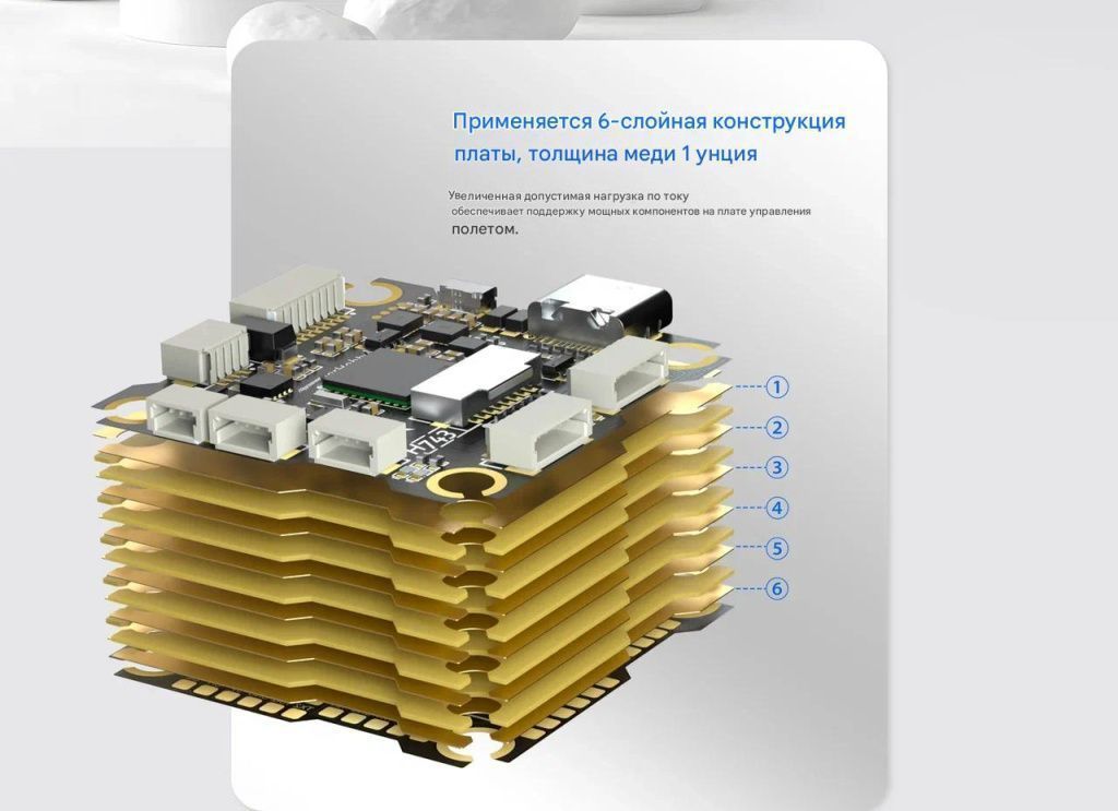 Шестислойная плата с медным покрытием, двойной BEC и чистое питание видеосистемы делают его надёжным ядром любой сборки.
