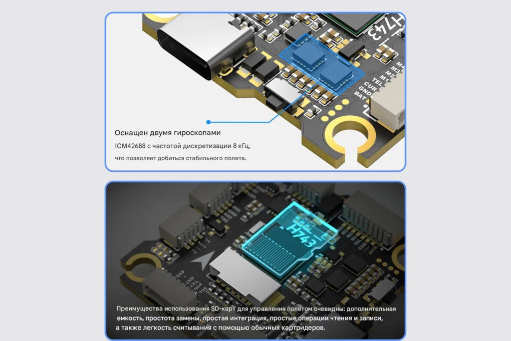 Он обеспечивает чистое питание, мощную обработку данных и поддержку профессиональных прошивок Betaflight и Ardupilot,