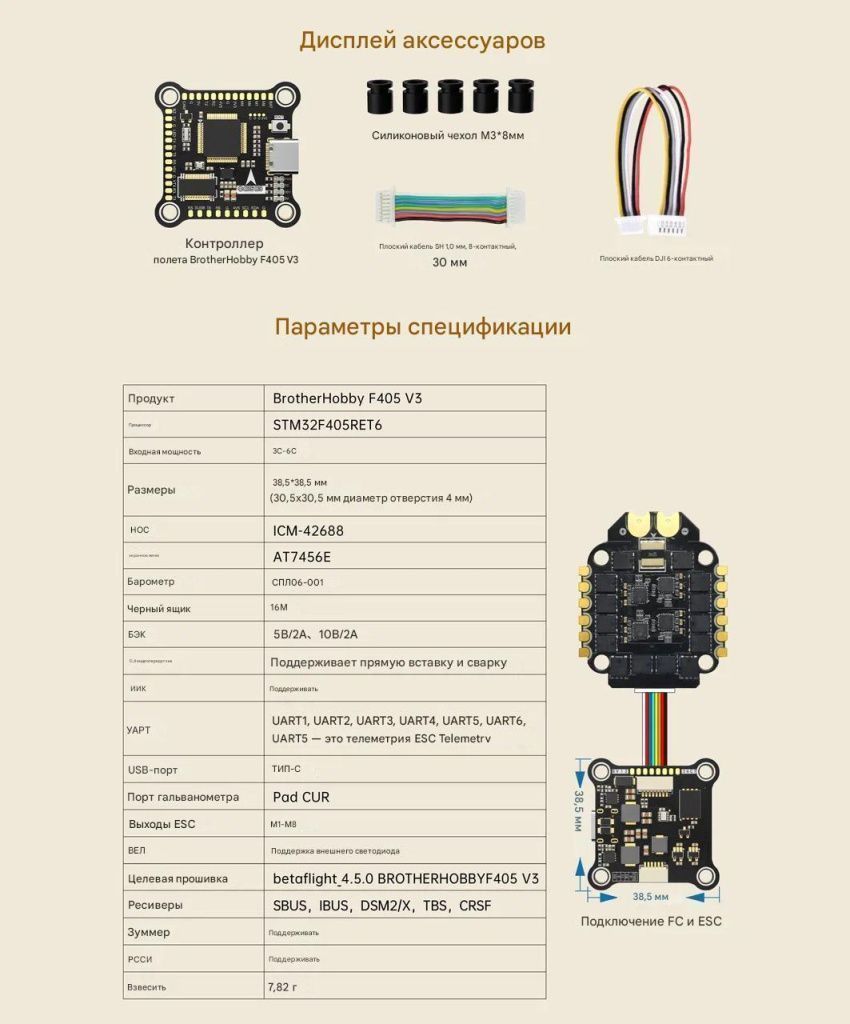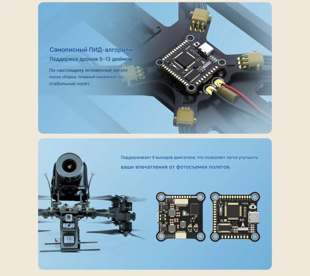 Контроллер оснащён мощным процессором STM32F405, чувствительным гироскопом ICM42688, встроенным барометром, памятью 16 МБ для логов, а также двойным независимым BEC (5V/2A + 10V/2A) для питания цифровых и аналоговых систем.