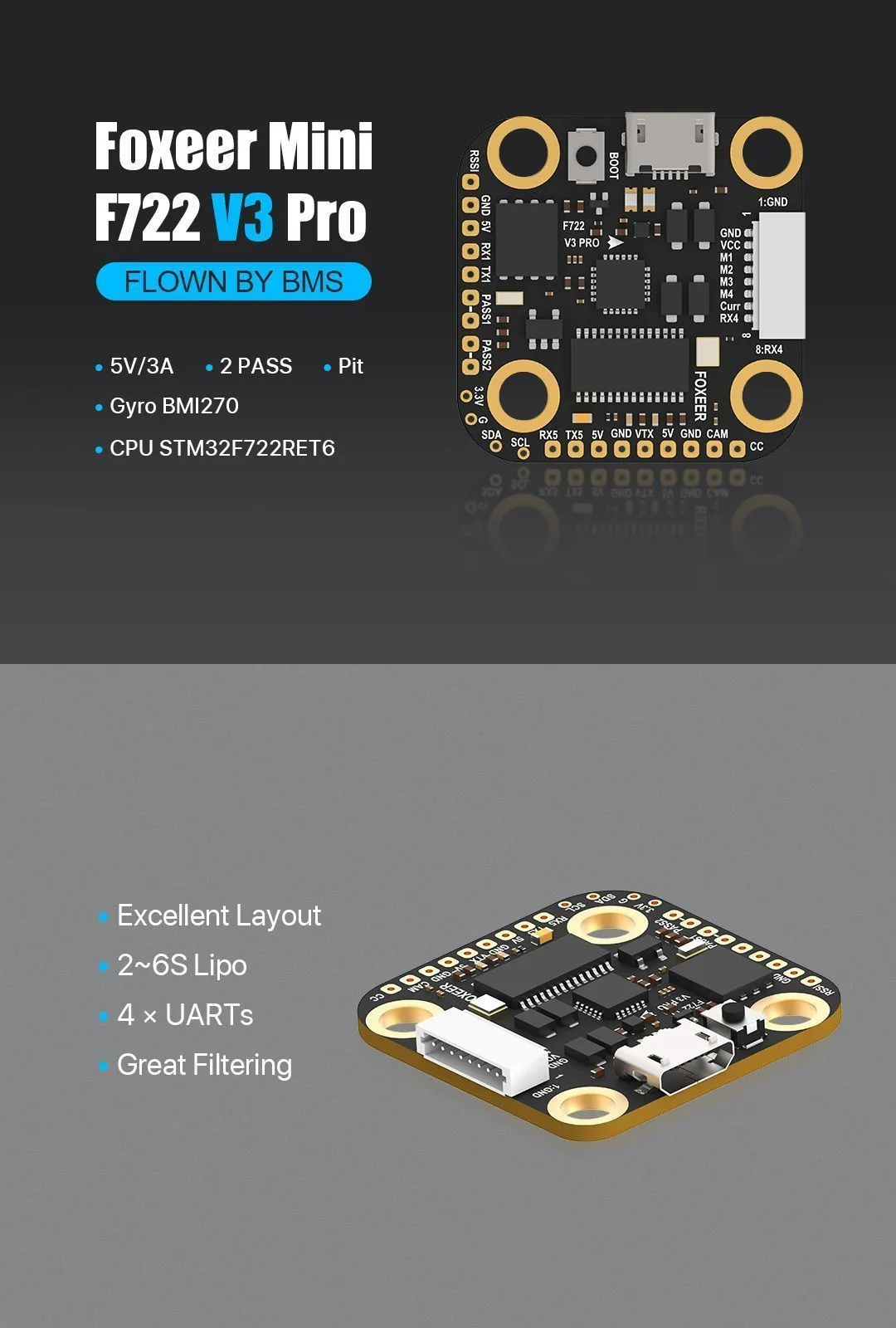 Компактный полетный контроллер третьего поколения формата Mini Pro (28.5x28.5 мм) на базе процессора STM32F722RET6 и гироскопа BMI270. Ключевая особенность модели — встроенная функция PASS с двумя проходными каналами (PASS1, PASS2), которые значительно упрощают подключение видеопередатчиков (например, TBS Unify Pro32 Nano) и приемников за счет прямой передачи питания и сигналов. Контроллер оснащен мощным BEC 5В/3А, 4 портами UART, 16 Мб памятью для черного ящика и выделенным выходом управления камерой.