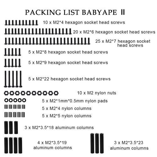 — Специфический крепеж для BabyApe II: Набор включает уникальные алюминиевые стойки (M2×3.5×18, 19, 23 мм), необходимые для сборки рамы именно этой модели, что гарантирует идеальную посадку.