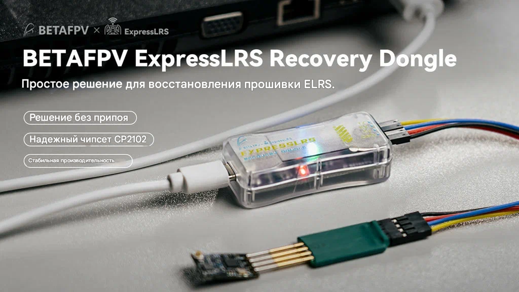 ExpressLRS Recovery Dongle — это специализированный FTDI-адаптер USB to TTL на базе контроллера CP2102, предназначенный для восстановления и обновления прошивки ELRS-приёмников и других устройств на базе чипов ESP32 и ESP8XX. Устройство оснащено подпружиненными контактными штифтами (spring probe pins), что позволяет подключаться к приёмнику напрямую без пайки. Закрытый корпус обеспечивает долговечность и портативность. Является незаменимым инструментом для «разваривания» (unbrick) приёмников после неудачного обновления по WiFi или passthrough. Общие характеристики — Тип: FTDI USB to TTL адаптер (программатор) — Модель: ExpressLRS Recovery Dongle — Назначение: Восстановление, обновление прошивки (UART) и восстановление загрузчика (bootloader) на ELRS-приёмниках, бэкпэках FPV-очков и других устройствах с чипами ESP32/ESP8XX — Ключевое преимущество: Беспаечное подключение (пружинные контакты), закрытый ударопрочный корпус, широкая совместимость с ОС — Базовый чип: CP2102 (USB to UART мост) — Интерфейс подключения к ПК: USB Type-C (штекер, male) — Интерфейс подключения к устройству: 2×4 контакта, шаг 2.54 мм (пин-хедер) — Метод контакта: Подпружиненные штифты (spring probe pins) для беспаечного подключения — Напряжение логики: 5 В — Выход питания 3.3 В: до 400 мА — Максимальная скорость Serial: до 921600 бит/с — Поддержка USB: USB 1.1, USB 2.0 Ключевые особенности — Беспаечное подключение: Уникальная конструкция с подпружиненными контактными штифтами позволяет подключить донгл напрямую к контактным площадкам приёмника без пайки, что критически важно при восстановлении «убитых» устройств и для пользователей без опыта пайки. — Восстановление нерабочих приёмников (Unbrick): Основное назначение — восстановление ELRS-приёмников, которые перестали определяться или отвечать после неудачного обновления прошивки по WiFi, с помощью прямого программирования по UART. — Универсальная совместимость: Работает со всеми распространёнными ELRS-приёмниками BETAFPV (Lite, Nano, Micro), а также с бэкпэками очков и другими устройствами на базе ESP32/ESP8285/ESP8266. — Кроссплатформенность: Поддерживает Windows (требуется драйвер), macOS и Linux (без драйверов) — идеально для любой операционной системы. — Защищённый корпус: В отличие от «голых» FTDI-плат, донгл помещён в прочный пластиковый корпус, что защищает компоненты от статики, механических повреждений и делает его удобным для переноски в полевых условиях. Технические характеристики — Интерфейс к ПК: USB Type-C (встроенный штекер) — Интерфейс к устройству: 2×4 пин-хедер (2.54 мм) с пружинными контактами — Чип USB-UART: Silicon Labs CP2102 — Напряжение питания (от ПК): 5 В — Выходное напряжение 3.3 В: до 400 мА (для питания целевого устройства) — Логические уровни: 5 В (вход/выход) — Поддерживаемые скорости: до 921600 бод — Поддерживаемые ОС: — Windows XP / 7 / 8 / 10 / 11 (32/64 бит) — требуется установка драйвера — Linux — Plug-and-Play — macOS — Plug-and-Play — Комплектация: Донгл + адаптер + кабель Область применения — Восстановление (unbrick) ELRS-приёмников после неудачной прошивки по WiFi. — Первоначальная прошивка новых приёмников через UART. — Обновление прошивки бэкпэков (Backpack) в FPV-очках. — Работа с любыми устройствами на базе ESP32/ESP8285, требующими UART-программирования. — Использование в полевых условиях и на соревнованиях для быстрого восстановления оборудования. Комплектация поставки — ExpressLRS Recovery Dongle (в корпусе) — 1 шт. — Пробный конвертер плата (Probe Converter Board) — 1 шт. — 4-пиновый соединительный кабель — 1 шт. — Пр