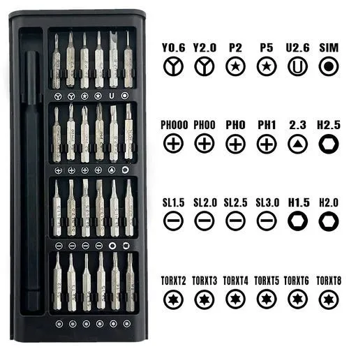 — Полный охват крепежа для электроники: 24 биты 9 различных типов (шлицевые, крестовые, Torx, шестигранные, Tri-wing и др.) охватывают подавляющее большинство винтов, встречающихся в современной электронике и FPV-оборудовании. Это готовое решение для сервисных служб и полевых бригад, исключающее необходимость иметь при себе множество отдельных отверток.