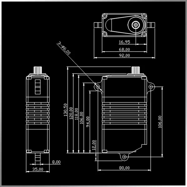 KMV300 — Двигатель: бесщеточный; Шестерни: стальные; Шлиц: 25T (12 мм); Подшипники: 3BB; Зона нечувствительности: 2 μs; Влагозащита: нет; Рабочее напряжение: DC24–32V; Номинальное напряжение: DC30V; Частота: 1520 μs/330Hz; Угол поворота: ±100°@500–2500 μs; Рабочая температура: –30…+65 °C; Хранение: –40…+70 °C