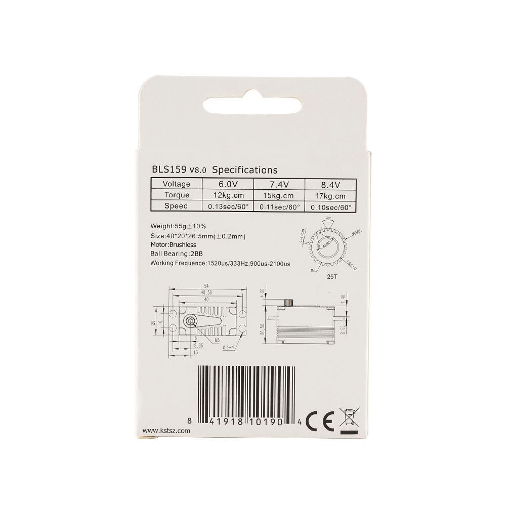 KST BLS159 — низкопрофильный бесщёточный цифровой HV-сервопривод с корпусом из алюминия, металлическими шестернями и широким диапазоном входного напряжения от 6.0 до 8.4 В, что делает его отличным выбором для различных RC-приложений: багги 1/10 2WD или 4WD, дрифт-кары и другие модели, где требуется компактный сервопривод.