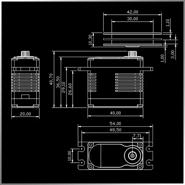 KMSW02BS — Шестерни: стальные; Шлицы: стандарт 25T; Двигатель: бесщеточный; Подшипники: 2BB; Мёртвая зона: 2 μs (по умолчанию); Влагозащита: есть; Рабочее напряжение: DC5.0–8.4V; Номинальное рабочее напряжение: DC7.4V; Рабочая частота: 1520 μs / 330 Hz; Рабочая температура: −10…+50 °C; Температура хранения: −20…+60 °C