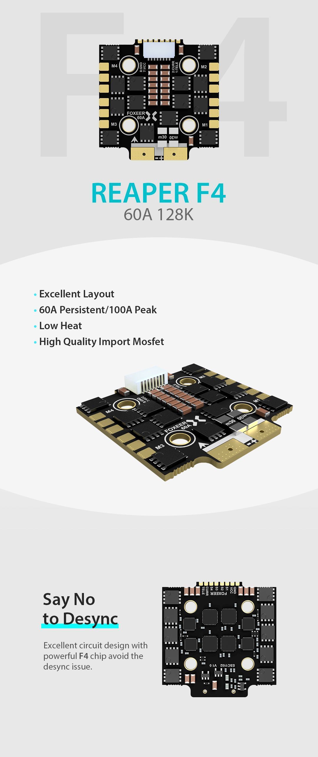 — Защита от десинхронизации: Оптимизированная силовая схема на мощном чипе F4 и качественных MOSFET эффективно предотвращает срыв синхронизации (desync) моторов в экстремальных режимах.