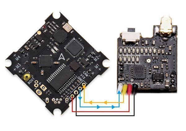 Комбинированная AIO-камера H02 5.8G 25mW — это компактный и лёгкий моноблок (камера + видеопередатчик) с поддержкой OSD, представляющий собой усовершенствованную версию популярной VM275T. Устройство весом всего 3.6 г оснащено сенсорным переключателем каналов, поддержкой PAL/NTSC и функцией переворота изображения. Идеально подходит для микро-дронов формата whoop (например, Blade Inductrix) и совместимо с полётными контроллерами BETAFPV, поддерживающими OSD. Общие характеристики — Тип: AIO (All-In-One) FPV камера с видеопередатчиком и поддержкой OSD (Camera + VTX + OSD) — Модель: H02 AIO Camera 5.8G 25mW VTX OSD — Назначение: Микро-дроны формата whoop, Blade Inductrix и аналоги — Ключевое преимущество: Минимальный вес и размеры при наличии функции OSD и удобного сенсорного управления — Выходная мощность VTX: 25 мВт — Угол обзора (FOV): 120° (горизонтальный) — Важное примечание: Существует новая и старая версия устройства, различающиеся расположением красного и чёрного проводов на разъёме. При подключении необходимо свериться с соответствующей схемой. Ключевые особенности — Интегрированная функция OSD: Позволяет выводить телеметрию (напряжение батареи, таймер) прямо на FPV-видеосигнал при подключении к совместимому полётному контроллеру. — Удобное сенсорное управление: Переключение каналов, диапазонов, стандарта видео (PAL/NTSC) и отражения изображения (FLIP) осуществляется лёгким касанием. — Наглядная светодиодная индикация: 8 светодиодов отображают номер канала, 5 — группу частот, 1 — режимы PAL/NTSC/FLIP. — Широкий частотный диапазон: 40 каналов в 5 группах (A-E) плюс отдельная группа Raceband (F), что обеспечивает хорошую совместимость с другими пилотами и приёмниками. — Лёгкость и компактность: Вес 3.6 г и габариты 47x14.8x12.5 мм минимизируют влияние на лётные характеристики микро-дронов. Технические характеристики — Вес: 3.6 г — Размеры (ДxШxВ): 47 x 14.8 x 12.5 мм — Датчик: 1/4", PAL: 720x540 / NTSC: 640x480 — Угол объектива: H:120° / V:100° — Диапазон частот: 5.8 ГГц, 40 каналов (5 групп + Raceband F), 5362–5945 МГц — Выходная мощность VTX: 25 мВт (13±1 дБм) — Потребляемый ток: 200–215 мА @ 5В — Напряжение питания: 2.9 – 5.5 В — Порт антенны: 50 Ω — Антенна: Эксклюзивная дипольная (Dipole Whip Antenna) — Температурный режим: -10°C ~ +60°C Подключение и совместимость — Устройство совместимо с полётными контроллерами BETAFPV для whoop-дронов, поддерживающими OSD. — Внимание, распиновка: В зависимости от партии (новая или старая версия) расположение красного (питание +) и чёрного (питание -) проводов на 4-пиновом разъёме может различаться. Перед подключением обязательно сверьтесь со схемой, соответствующей вашей версии устройства. Область применения — Установка на микро-дроны формата whoop (Blade Inductrix, BetaFPV whoop-серии). — Модернизация готовых моделей для добавления OSD-функции. — Любые проекты микро-БПЛА, где критичны вес и размеры, но требуется вывод телеметрии. Комплектация — Модуль H02 AIO Camera 5.8G 25mW VTX OSD ×1 — Пластиковый козырек (canopy) ×1 Варианты исполнения (доступные опции) Устройство поставляется в двух аппаратных версиях (новая и старая), различающихся только расположением проводов питания (красного и чёрного) на разъёме. Функциональность и остальные характеристики идентичны. При получении заказа и перед подключением обязательно определите версию устройства и сверьтесь с соответствующей схемой соединения во избежание повреждения оборудования. Конкретную версию, поставляемую в данный момент, можно уточнит