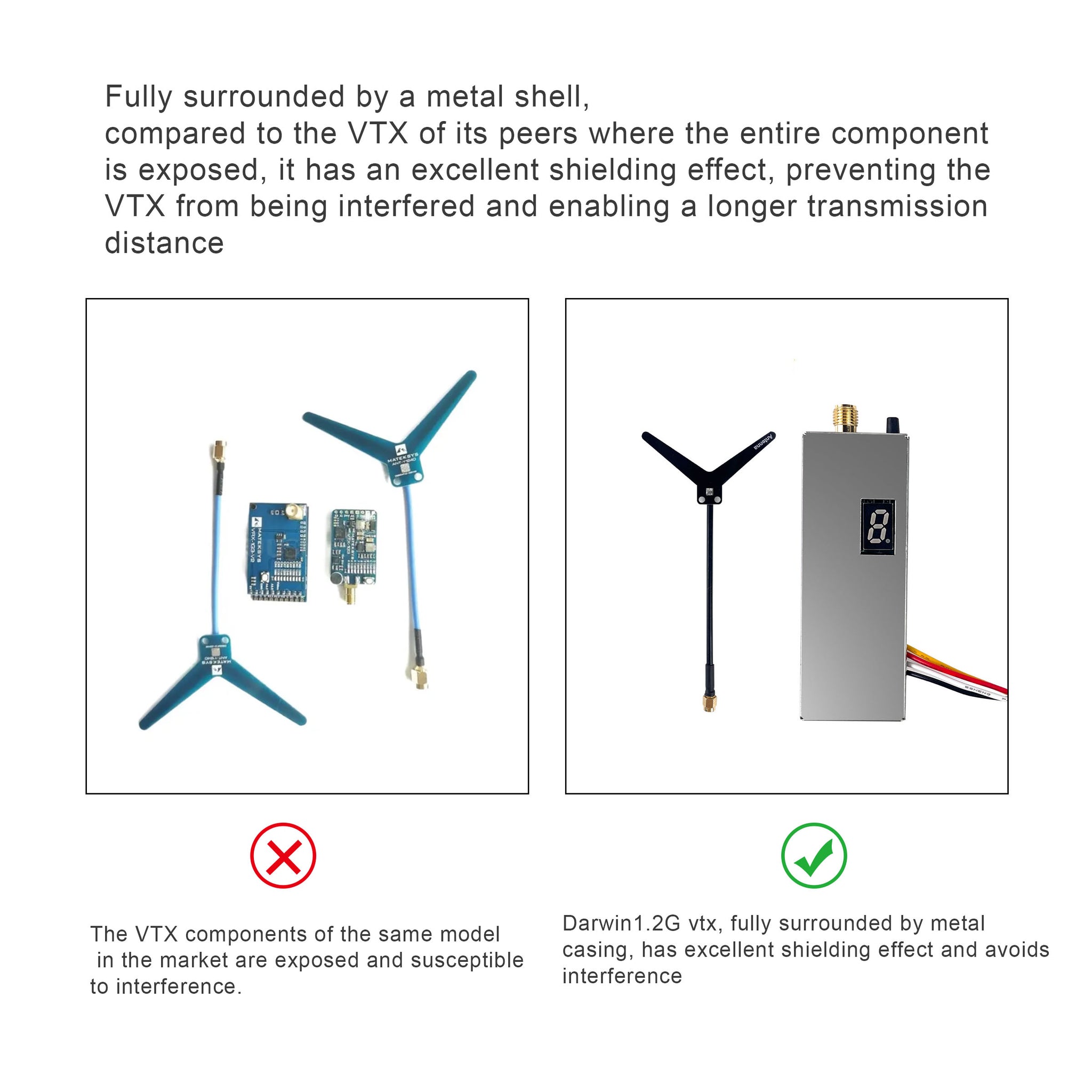 — Полное металлическое экранирование: Корпус полностью окружает электронные компоненты, обеспечивая превосходную защиту от внешних электромагнитных помех и предотвращая излучение самого VTX, что положительно сказывается на общей дальности и чистоте сигнала.