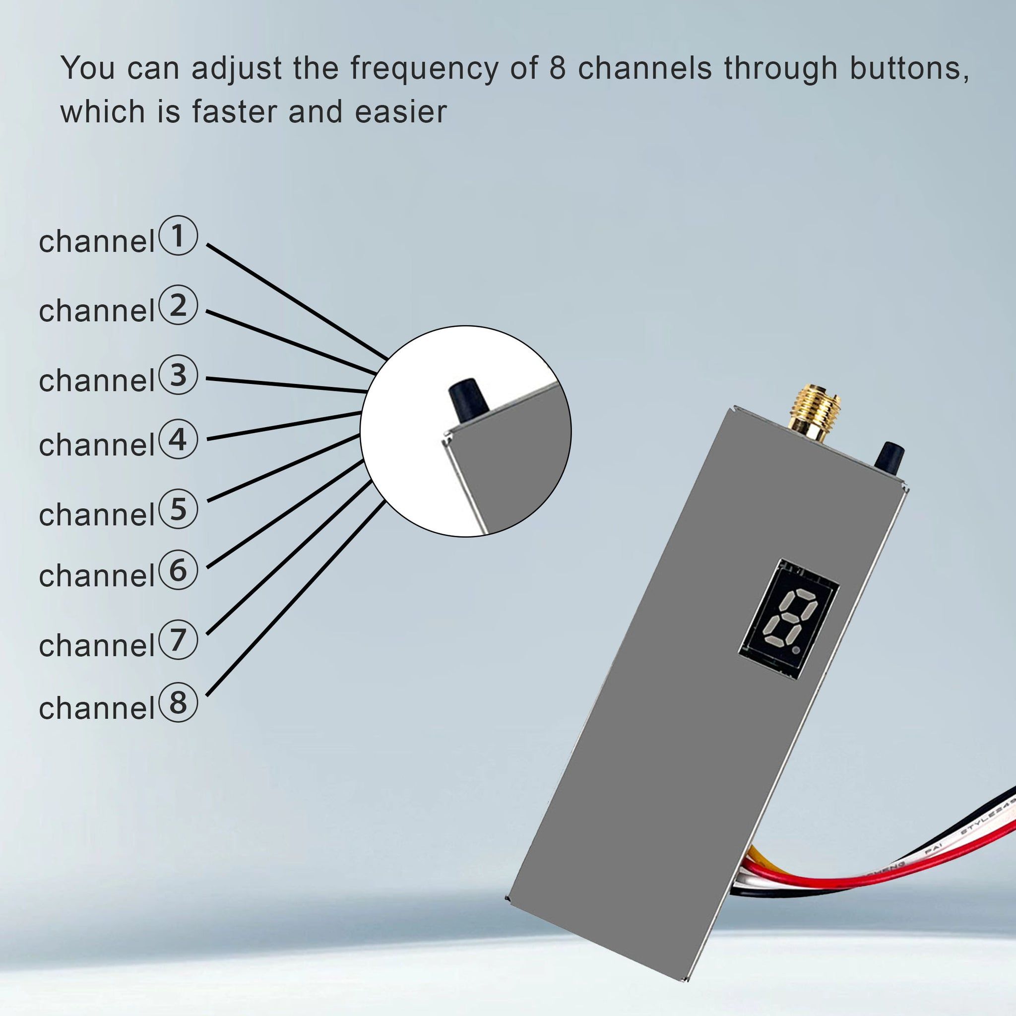 — Простота настройки: Переключение между 8 предустановленными частотами осуществляется одной кнопкой и отображается на цифровом индикаторе, что исключает необходимость в сложном программном обеспечении или OSD.