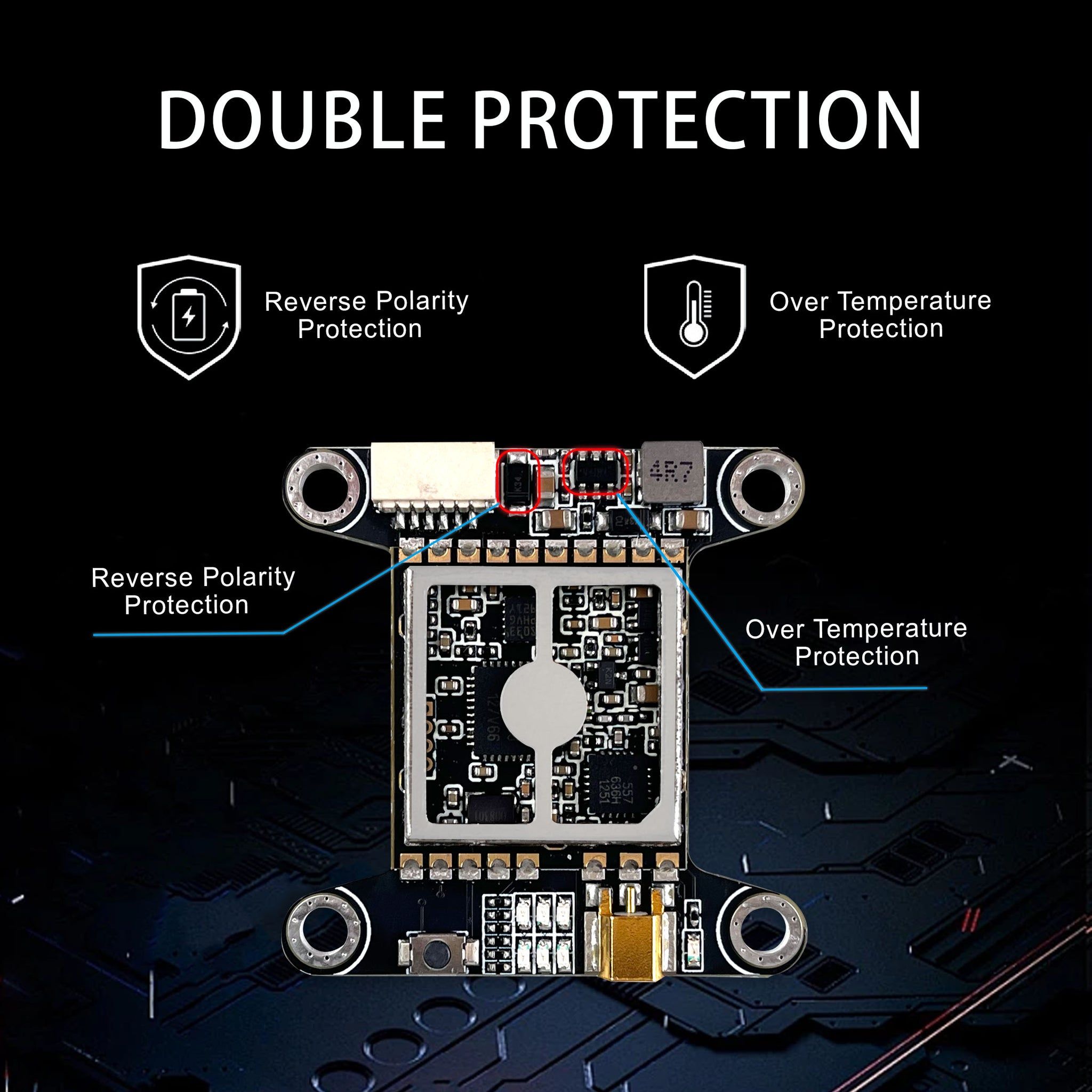 — Комплексная защита электроники: Встроенные схемы защиты от переполюсовки и перегрева многократно повышают надежность VTX и защищают его от нештатных ситуаций в электросети дрона.