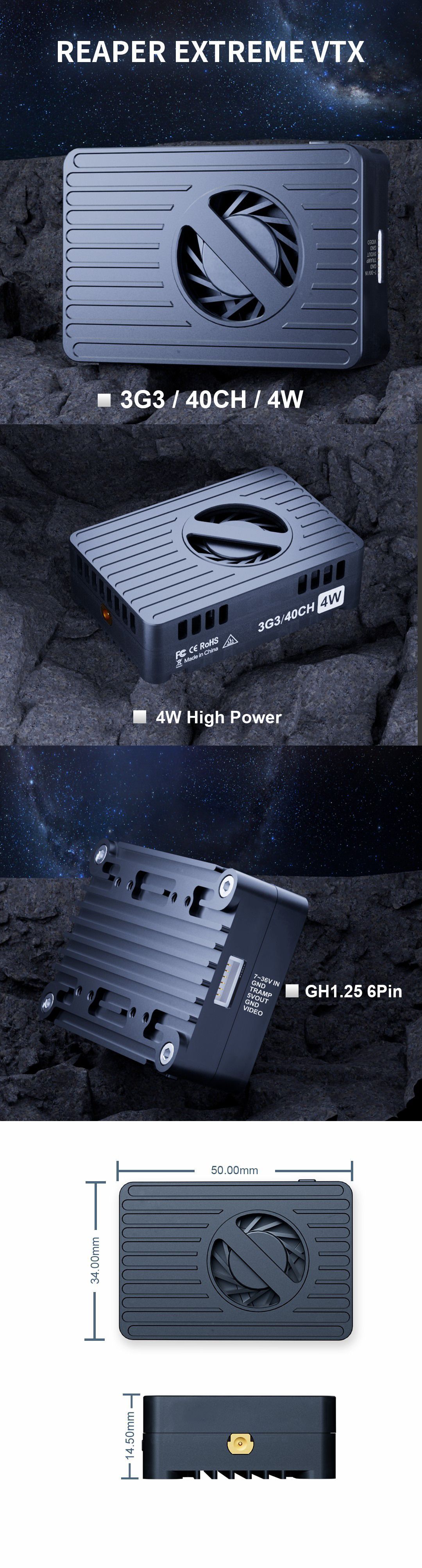 Мощный 4-ваттный видеопередатчик для FPV, работающий в диапазоне 3.3 ГГц (S-Band) с поддержкой 40 каналов и протоколом управления Tramp. Оснащен встроенным вентилятором для активного охлаждения, что позволяет длительно работать на максимальной мощности. Подходит для дальних полетов, а также для специальных задач, требующих высокой мощности и стабильности видеосигнала.